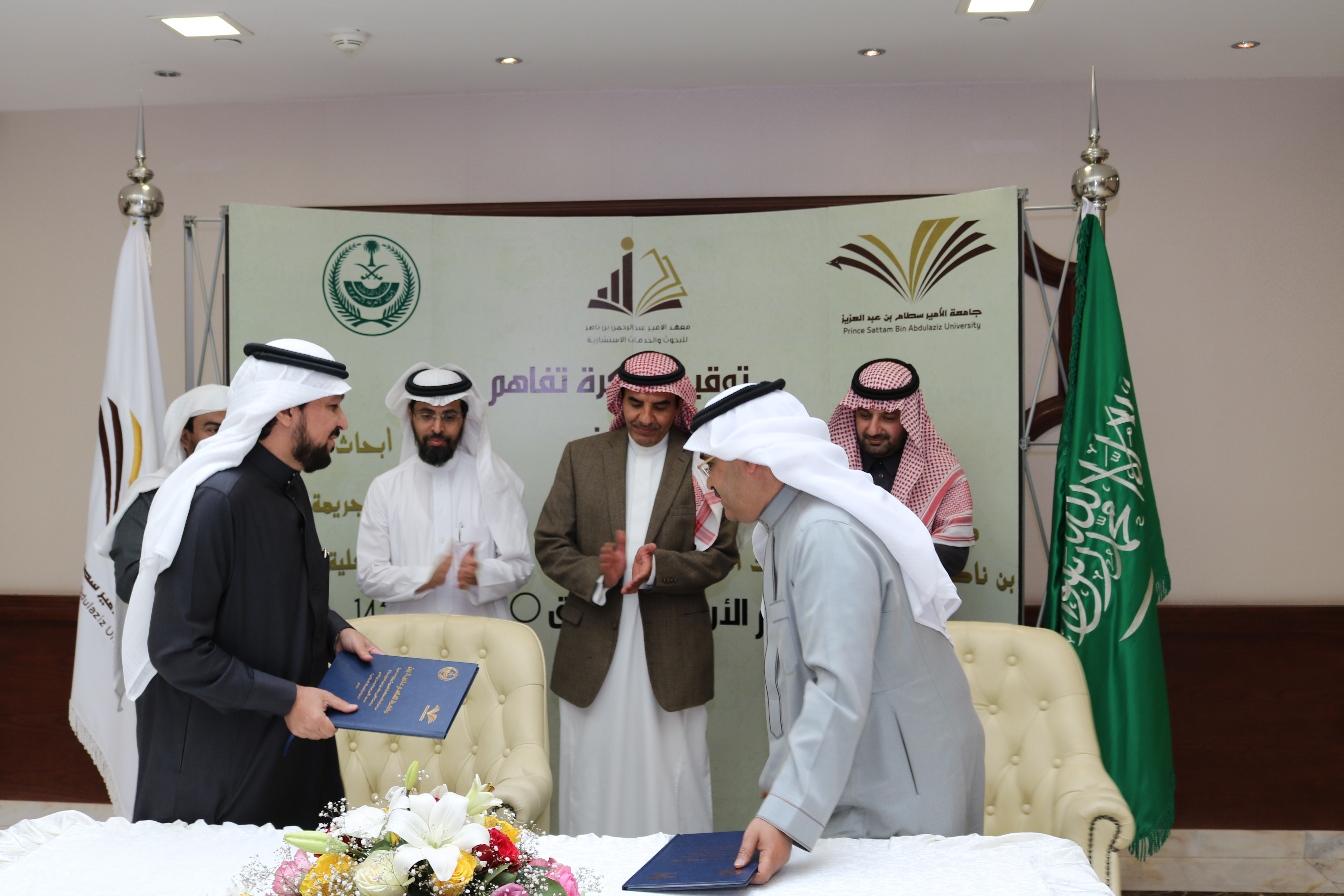 وقد وقع المذكرة من قبل الجامعة الدكتور عبد العزيزبن عبدالله الحامد وكيل الجامعة للدراسات العليا والبحث العلمي نائب رئيس مجلس إدارة المعهد ومن قبل مركز الأبحاث الدكتور ذعاربن نايف بن محيا مدير عام مركز أبحاث مكافحة الجريمة أمين اللجنة العليا .