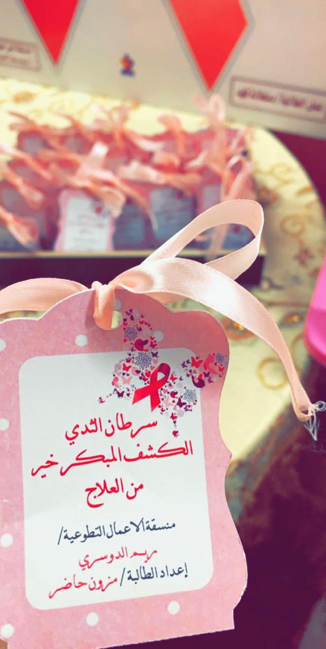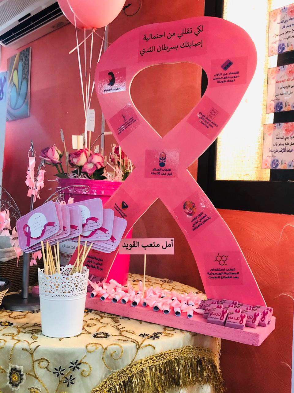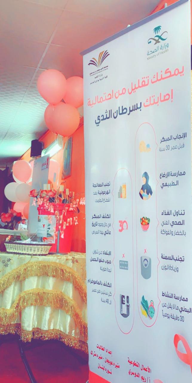 وقد بدأت فعاليات الحملة بإلقاء محاضرة من الدكتورة سهام محمد عبد الرحيم عن سرطان الثدي وضحت فيها نسب الإصابة بسرطان الثدى ومسبباته وطرق الوقاية منه وقامت بتدريب الحضور على طرق الفحص الذاتي للثدي وكيفية التعرف على تغيرات الثدي التي تستدعى المراجعة الطبية وعرضت احصائيات وحقائق مرتبطة به . كما تطرقت إلى الجهود المبذولة لمكافحته بالمملكة العربية السعودية من حملات وبرامج توعوية واختتمت المحاضرة بالإجابة على أسئلة الحاضرات وصححت بعض المفاهيم الخاطئة عن مرض سرطان الثدي لهن ، تلاها محاضرة قدمتها الدكتورة منال عبد العليم السيد سلطت فيها الضوء على علاقة التغذية بالحد من انتشار سرطان الثدي والدور الذى تلعبه مضادات الأكسدة والفيتامينات ومجموعة الأوميجا في الوقاية منه . واختتمت المحاضرة بالإجابة عن أسئلة الحاضرات عن الأطعمة التي تتوفر فيها مضادات الأكسدة وفيتامين (ب) بأنواعه كما صاحب المحاضرات معرض تعريفي توعوي تضمن عددا من الأركان التي تهدف إلى نشر الوعى الصحي بين منسوبات الكلية وتم توزيع منشورات توعوية صحية للاطلاع على كل ما يتعلق بسرطان الثدي وشرائط باللون ( الزهري ) تضامنا مع شعار البرنامج وتم وضع لائحة بشكل مميز تم تعليق رسائل الحاضرات حول سرطان الثدي عليها وكان هناك اقبال على الحضور من جميع منسوبات الكلية وقد لاقى البرنامج قبول واستحسان جميع الحاضرات.