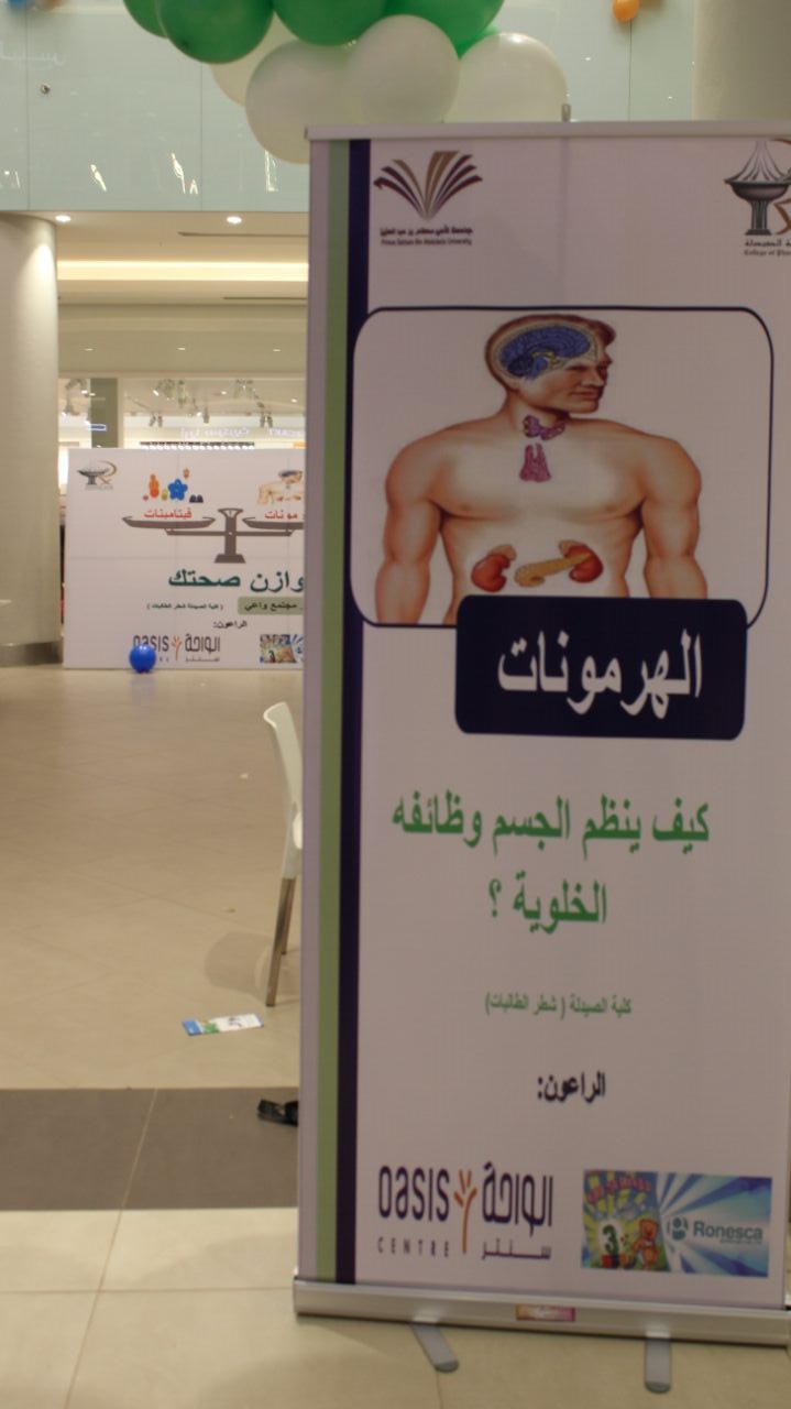 تفعيلاً لأنشطة خدمة المجتمع الذي تقوم به كلية الصيدلة -شطر الطالبات- ومن منطلق رؤيه ٢٠٣٠ نحو مجتمع واعي ومثقف تم تنظيم برنامج صحي بعنوان "وازن صحتك " برعاية شركة رونيسكا للتغذية بهدف توعية فئات المجتمع المختلفة بالفيتامينات والهرمونات وأهمية توازنها للجسم، حيث ضم البرنامج الذي أقيم بمجمع الواحة بالخرج يوم السبت الموافق ١٩-٢-١٤٣٨ أركاناً متنوعة فقد اهتم الركن الأول بالتعريف بهرمونات الغدة النخامية قدمته الطالبتان : بشاير الدوسري و في الجمعة ثم الركن الثاني تحدث عن الغدة الدرقية والجاردرقية قدمته الطالبات : منال العرفج وهيا الكنهل و رشا المطيري وتحدث الركن الثالث عن التعريف بالفيتامينات الذائبة بالدهون (أ ، ك،ه ،د) قدمته الطالبات : شيخة المقرن وأ مل صفحي و نورة القرين ثم تلاه الركن الرابع عن الفيتامينات الذائبة بالماء وتأثير نقص مستواها في الدم على الجسم وكيفية الوقاية من ذلك للطالبات لمى العمري و فاطمة الشهري و أنوار العتيبي بالإضافة إلى ركن للإستشارات الغذائية وركن تثقيفي وترفيهي للأطفال قدمته شركة رونيسكا للأغذية وقد لاقى البرنامج إقبال كبير من قبل أفراد المجتمع وحصل على إستحسانهم .