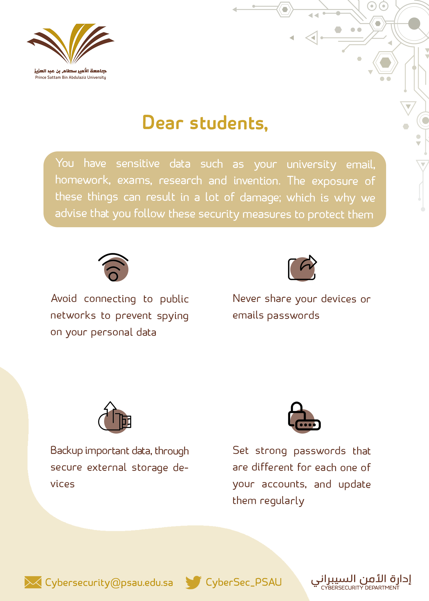لديكم بيانات حسّاسة مثل الرقم الجامعي و البريد الجامعي والواجبات والاختبارات والبحوث وبراءات الاختراع، والتي قد يترتب الكشف عنها الكثير من الضرر، لذلك ننصحكم بتطبيق التدابير الأمنية التالية لحمايتها: