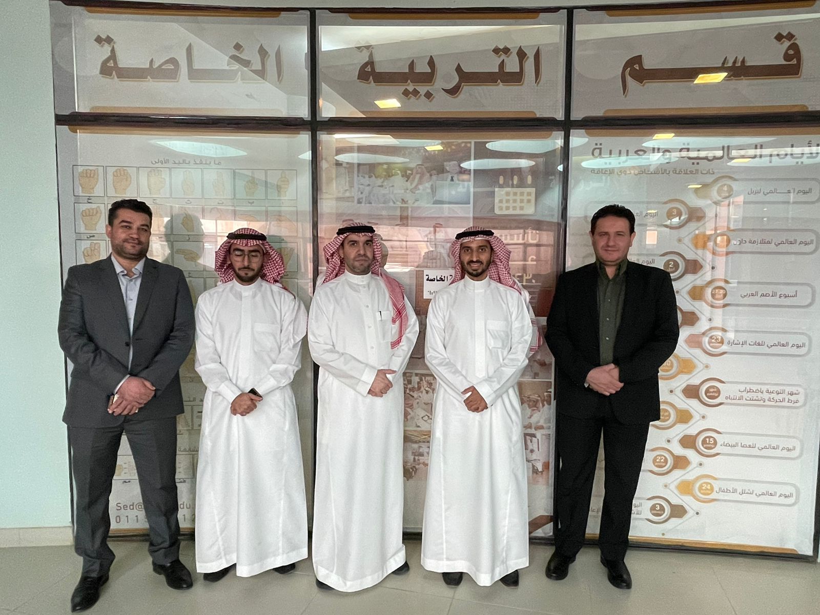 وفد من جامعة الإمام عبدالرحمن بن فيصل في زيارة رسمية لقسم التربية الخاصة بكلية التربية بالخرج ، وذلك في يوم الاثنين بتاريخ 26/3/1443هـ والموافق 1/10/2021م للاستفادة من خدمات وتجارب القسم النوعية في مجال الخدمات الانتقالية للأشخاص ذوي الإعاقة، والترجمة بلغة الإشارة، وتدريس لغة الإشارة للطلبة السامعين. وكان في استقبال الوفد سعادة الدكتور/عبدالهادي بن عبدالله العمري رئيس قسم التربية الخاصة بكلية التربية بالخرج، وضم الوفد كلاً من سعادة الدكتور/ يوسف بو سعد الجميعة رئيس قسم التربية الخاصة بجامعة الإمام عبدالرحمن بن فيصل، والدكتور/سامر محمد أبو دريع عضو هيئة التدريس بالقسم، و الأستاذ/ حسن محمد الخليل عضو هيئة التدريس بالقسم، والأستاذ/ ابراهيم فهد الحويطان من خريجي جامعة الأمير سطام بن عبدالعزيز والمعيد بقسم التربية الخاصة بجامعة الإمام عبدالرحمن بن فيصل بالدمام .