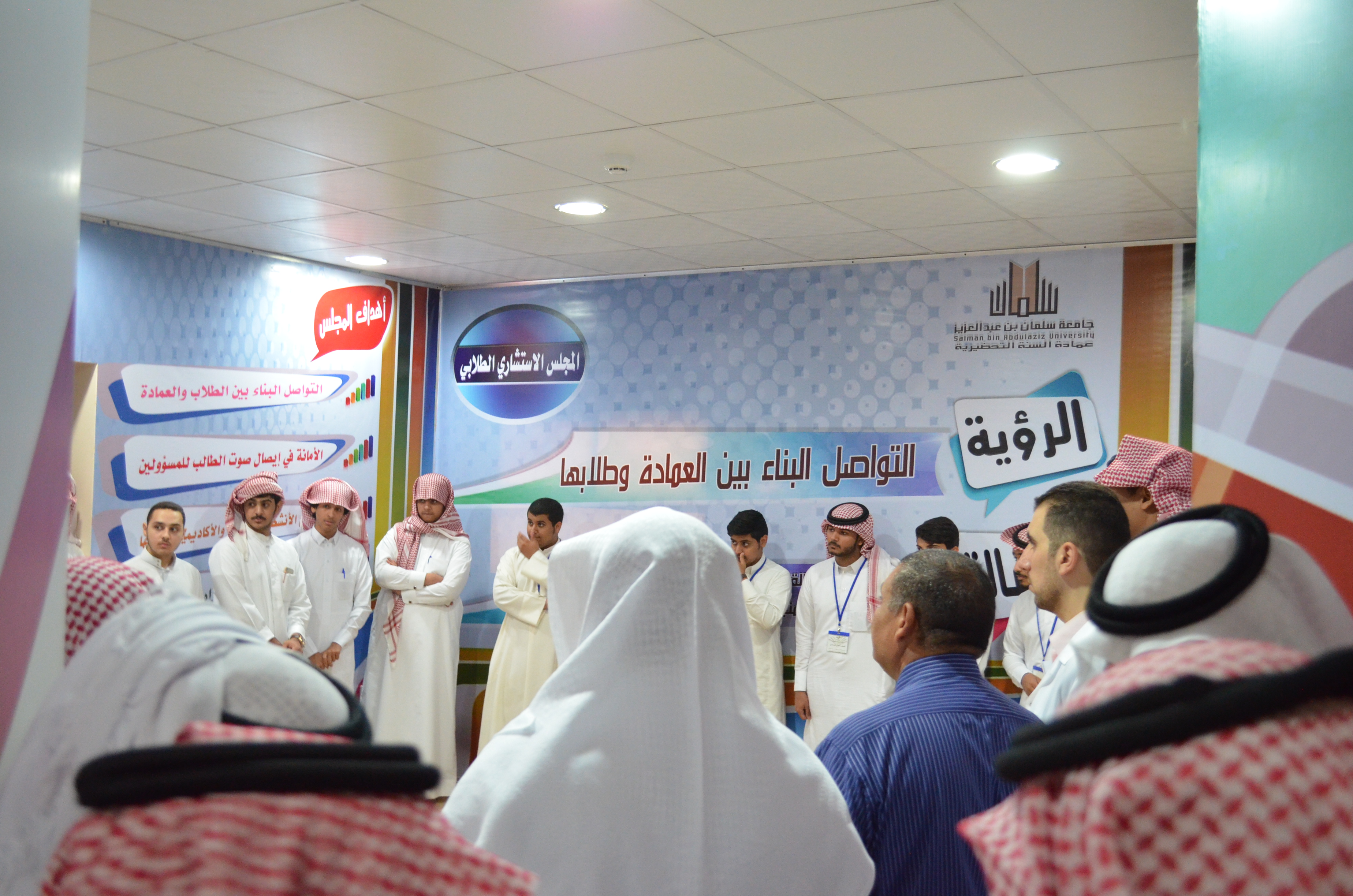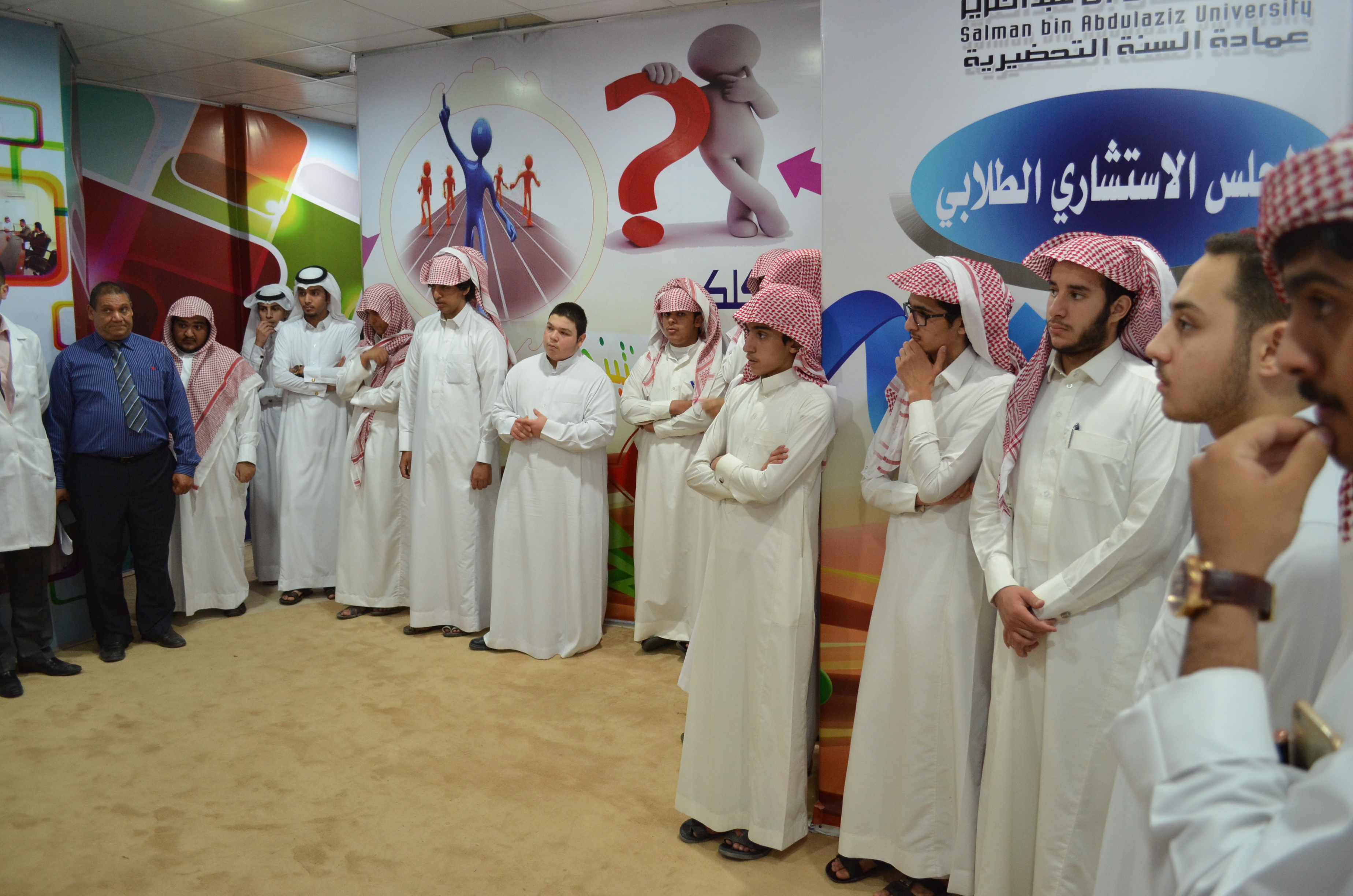 وبعد ذلك توجه الوفد إلى مقر المجلس الاستشاري الطلابي وكان في مقدمتهم رئيس المجلس الاستشاري الطالب عبدالله الدوسري حيث تحدث عن مهام المجلس ومن ثم قدم الطالب مهند المعيذر والطالب أحمد الرشيدي من أعضاء المجلس، عرضا بينا فيه كيفية الترشيح وآلية العمل، وتوجه الوفد بعد ذلك لمركز الأعمال لمشاهدة عرض مرئي يلخص إنجازات العمادة، وفي نهاية العرض قدم الوفد درعًا لعميد السنة التحضيرية الدكتور مشاري بن عياد العصيمي تسلمه بالنيابة الأستاذ فهد بن حسين منسق الأنشطة.