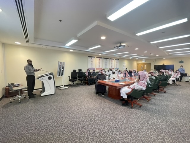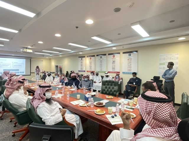 استقبل وفدَ الكلية الناظرُ الإداريُّ لقسم الإنتاج في المنطقة الوسطى المهندس أيمن النامي وممثل قسم العلاقات الحكومية في منطقة الرياض الأستاذ هيف آل شويه، وجمع من منسوبي الشركة وموظفيها، وقد استُهلَّ برنامج الزيارة بكلمة ترحيبية من المهندس النامي، ثم تلا ذلك عرض تقديميّ عن تاريخ الشركة، بدءًا من اكتشاف النفط، ومراحل تطور الشركة ونموها، إضافة إلى عروض تقديمية أخرى عن السلامة، وهندسة البترول، وعرض عن طرق الالتحاق بالشركة، بدءًا من مرحلة التقديم إلى مرحلة القبول، قدمه ممثلو قسم التوظيف في منطقة الرياض.