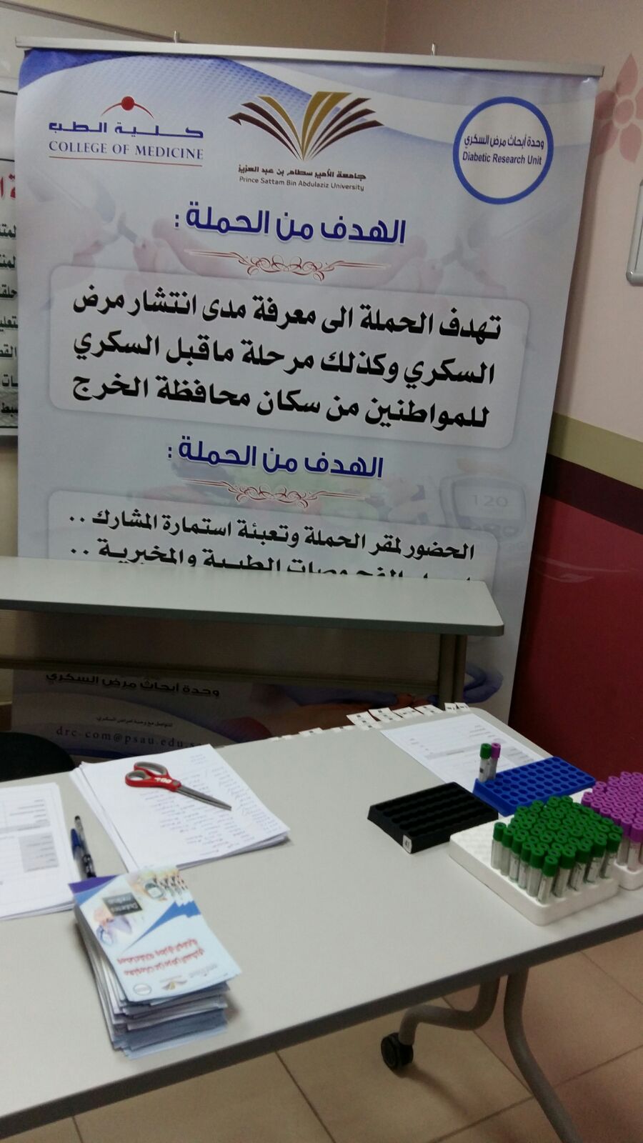 ضمن خدمة المجتمع قامت كلية الطب البشري ممثلة بوحدة أبحاث مرضى السكري بعمل حملة صحية شاملة وذلك يومي الأحد والإثنين الموافق 1437/5/6-5هـ في العيادة الطبية بمبنى كلية الصيدلة بهدف معرفة مدى انتشار مرض السكري وكذلك مرحلة ما قبل السكري للمواطنين من سكان محافظة الخرج ،حيث تم الحضور لمقر الحملة وتعبئة استمارة يدون فيها المشترك كل المعلومات الصحية عن حالته وأرقام التواصل ومن ثم يتم قياس العلامات الحيوية له كالضغط والنبض والوزن والطول وتسجيلها بالإستمارة ثم سحب عينة دم لعمل فحص لمستوى السكرالتراكمي بالدم بالإضافة إلى تحليل وظائف الكلى ومن ثم يتم التواصل لاحقاً مع المشترك لإخطاره بالنتائج وأي مشاكل صحية ممكن يعاني منها وسبل علاجها.