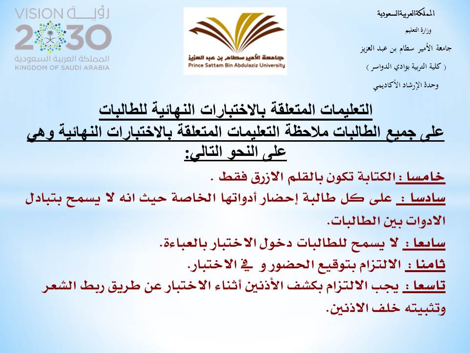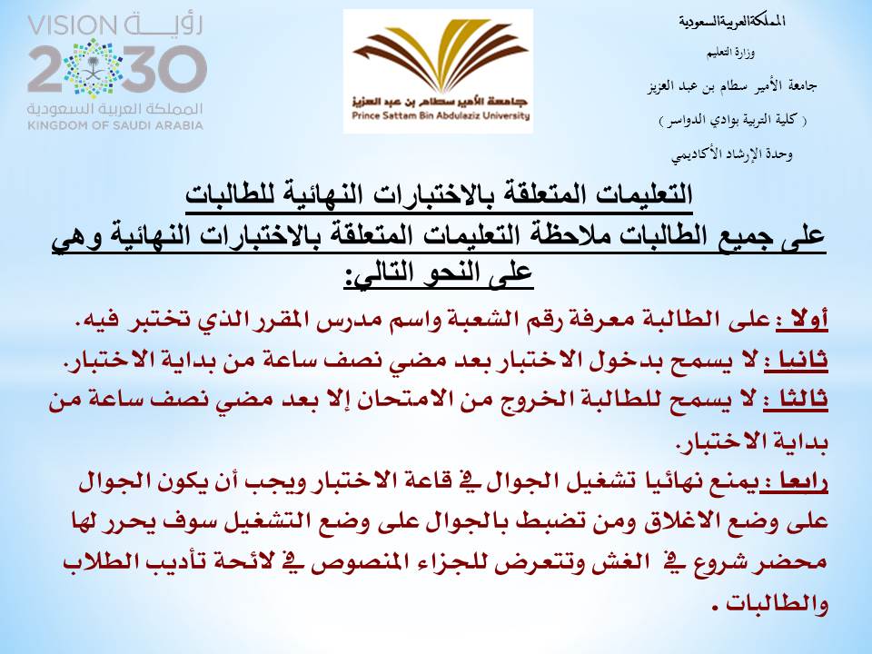 نظمت وحدة الإرشاد الأكاديمي برعاية عميد كلية التربية الدكتور/ماجد الشريدة ووكيلة الكلية الدكتورة /منال عبد العليم وتحت إشراف مشرفة وحدة الإرشاد الاكاديمي الأستاذة /داليا فوزي ورشة عمل بعنوان " تعليمات الاختبار النهائي " والتي دارة محاورها حول التعليمات والإرشادات التي يجب على الطالبات اتباعها اثناء فترة الاختبار النهائي ومنها الالتزام بوقت دخول الاختبار ووقت الخروج منه والتوقيع على حضور الاختبار وتعليمات استخدام الجوالات وغيرها من التعليمات الخاصة بالاختبارات وفي ختام الورشة أجابت الأستاذة / داليا فوزي على أسئلة واستفسارات الطالبات وعما يدور في أذهانهن حول تلك التعليمات. وقد عبرت الطالبات عن سعادتهن بما دار في اللقاء من توجيهات لهم وأهميته بالنسبة لهن لعبور فترة الاختبار بنجاح وأمان .