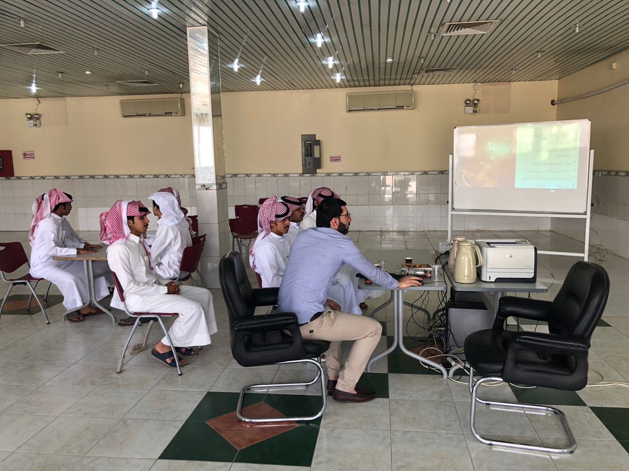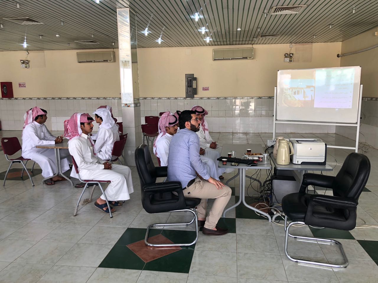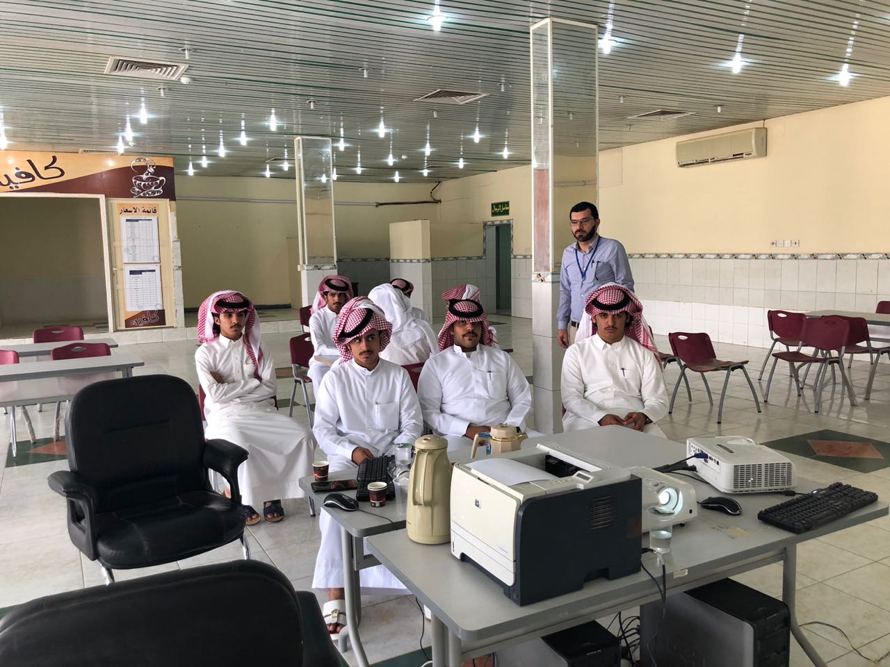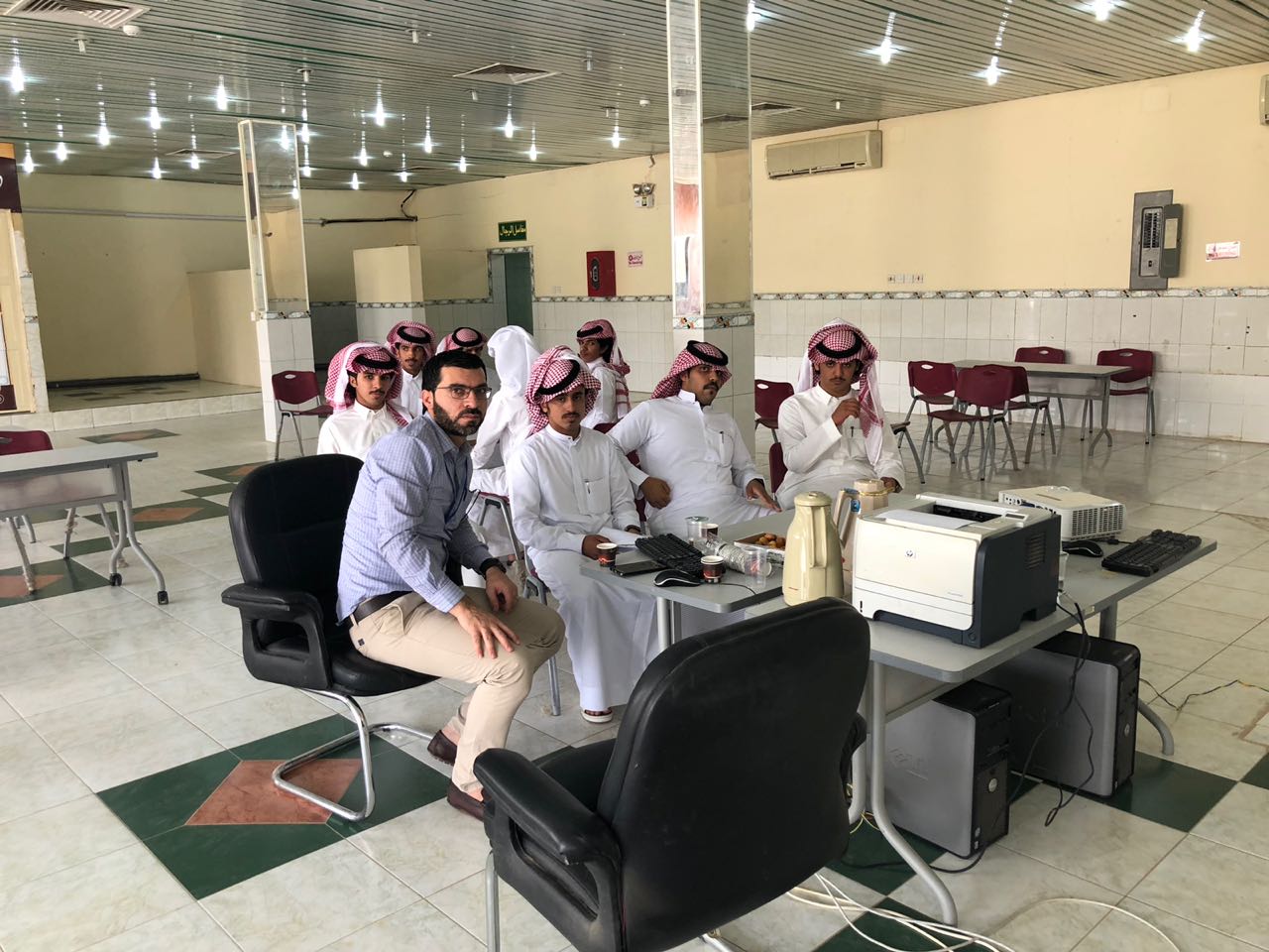 عقب ذلك بدأ أعضاء الإرشاد الأكاديمي بتكملة اللقاء وذلك على نحو خمس ايام متتالية تضمن التعريف بالأقسام والترحيب بالطلاب المستجدين ، ومن ثم تم عرض أهم الخدمات التي تقدمها الكلية وذلك من خلال عرض تقديمي يوضح الهيكل التنظيمي للكلية ، كما تم الإشارة إلى أهمية الأندية الطلابية وأهدافها وحث الطلاب على الانضمام للأندية .