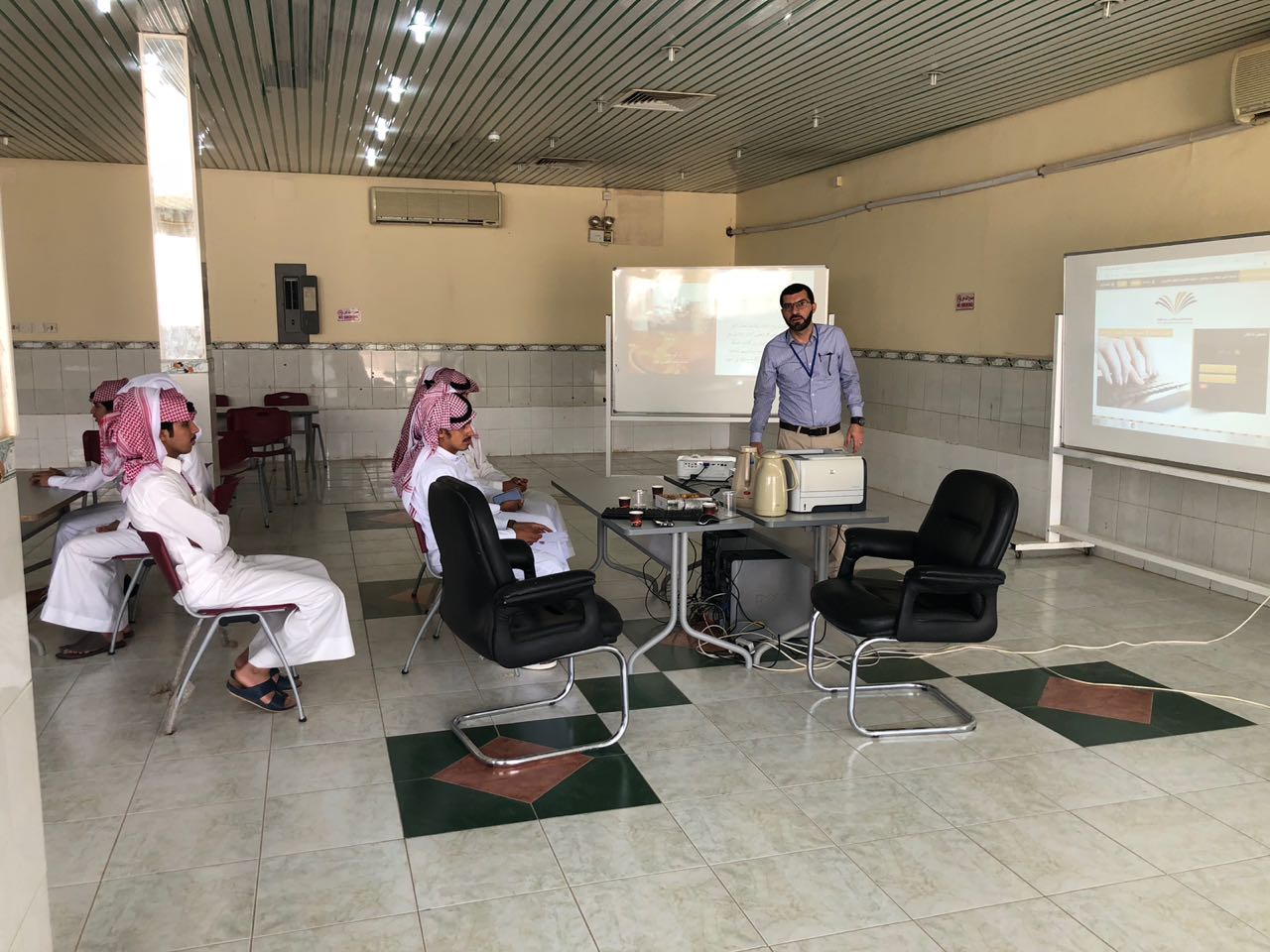 وبعد الانتهاء فتح المجال للمداخلات ، وكانت أسئلة الطلاب تدور حول كيفية استخراج البطاقة الجامعية وموعد استلام بطاقات الصراف الآلي لاستلام المكافآت وغيرها.