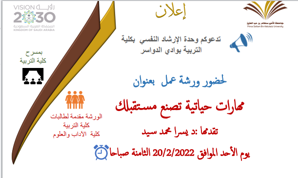 تحت رعاية سعادة عميد الكلية الدكتور/ ياسر بن مبارك الدوسري، ، أقامت وحدة الإرشاد النفسي بكلية التربية ورشة عمل بعنوان " مهارات حياتية تصنع مستقبلك " يوم الأحد19 / 7 / 1443هـ الموافق 20 / 2 / 2021م في تمام الساعة الثامنة صباحاً بمسرح كلية التربية ،استهدفت الورشة طالبات كلية التربية و كلية الآداب و العلوم ، حيث قدمتها الدكتورة/ يسرا محمد سيد عبد الفتاح أستاذ مناهج و طرق تدريس علم النفس المساعد بقسم العلوم التربوية. وتناولت من خلالها عدة محاور أهمها : مقدمة عن المهارات الحياتية ، مهارات العرض الفعال ، مهارات التحدث و الاستماع ، مهارة التلخيص ، مهارة السرد و الإلقاء ، وأثر تلك المهارات في اختيار مهن المستقبل و إعداد الشخصية . وقد شهدت الورشة تفاعل فعال بين الحضور وأبدى الجميع شكرهم لكلية التربية على جهودها في تلبية احتياجاتهم وتطوير قدراتهم بما يعود بالنفع على الطالبات وجودة العملية التعليمية.