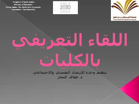 بإشراف وكيلة السنة التحضيرية د. أمل بنت صالح الشمراني ومساعدة الوكيلة د. حنان البحرى في إطار التعاون المتبادل بين الكليات وتفعيل الخطة الزمنية للقسم والتي تهدف إلى دعم مسيرة الطالبات التعليمية أقامت وحدة الإرشاد النفسي والإجتماعي بعمادة السنة التحضيرية "اللقاء التعريفي بالكليات" بجامعة الأمير سطام بن عبد العزيز.