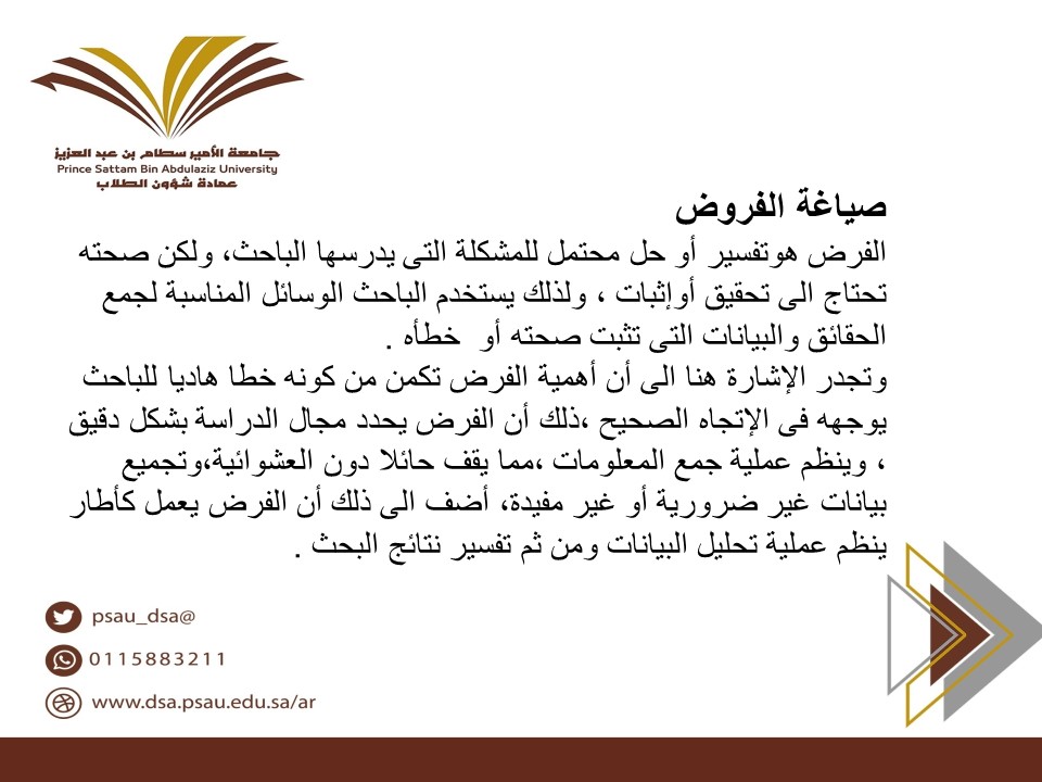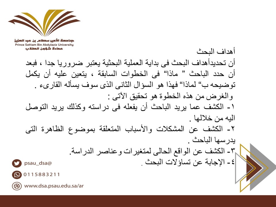 - توضيح مكونات البحث العلمي وكيفية صياغتها صياغة سلمية ودقيقة .