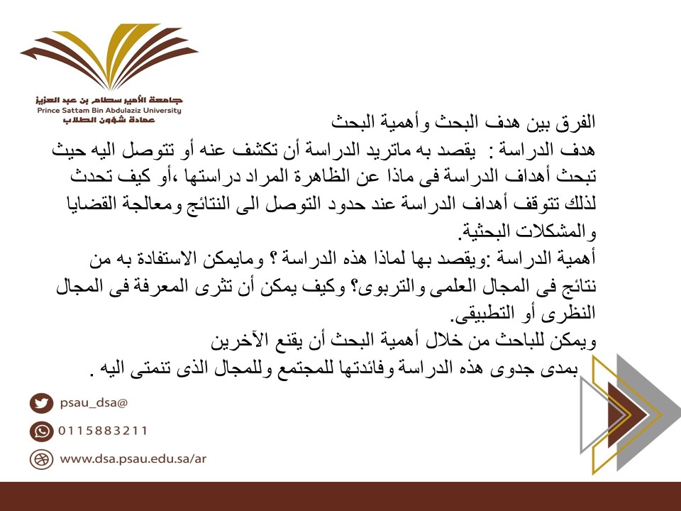 - التعرف على مهارات وأساليب وأهداف البحث العلمي .