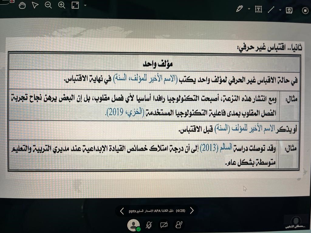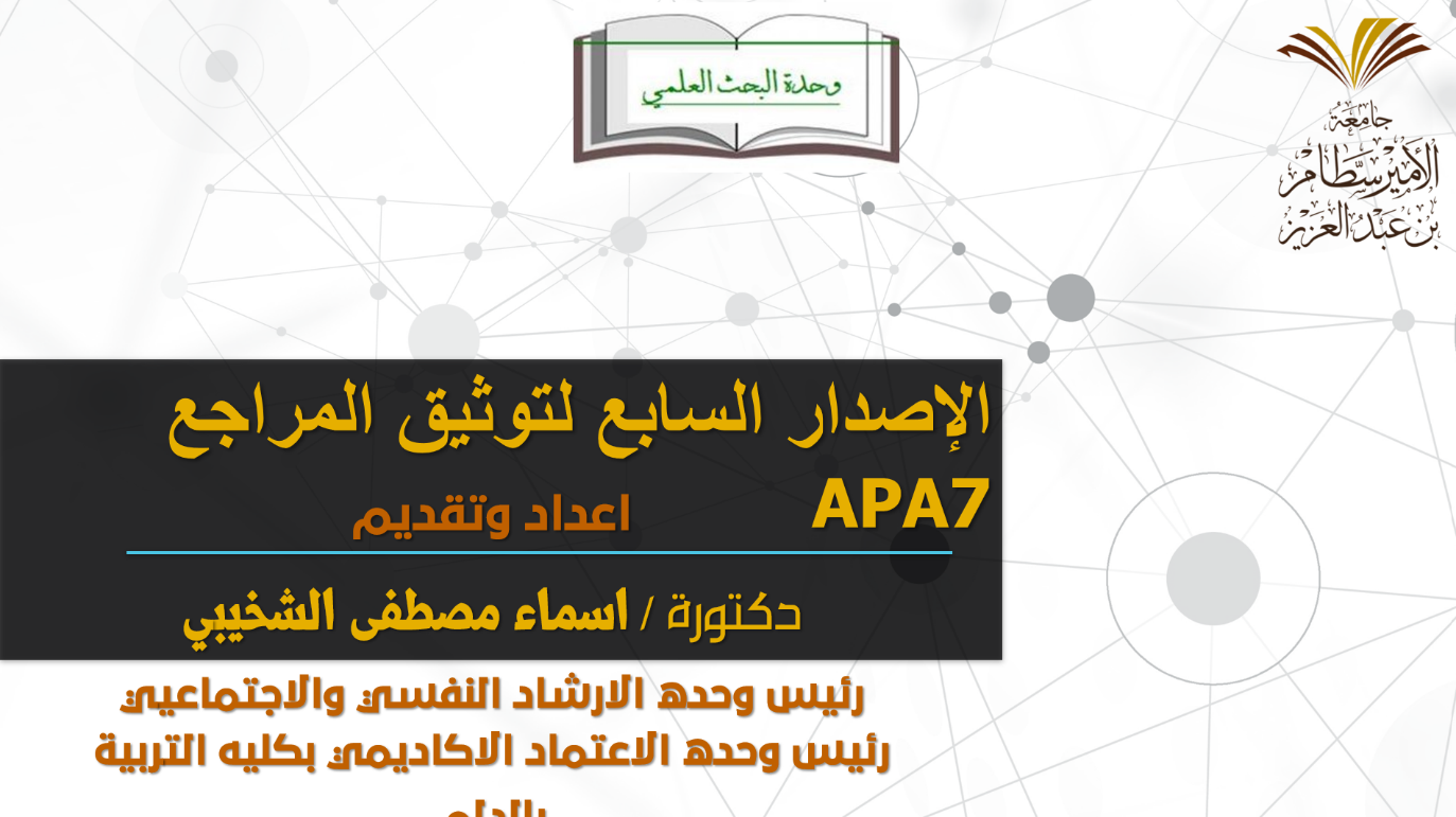 قدمتها الدكتورة/ أسماء الشخيبي –أستاذ علم النفس التربوي المساعد- وتهدف الى تنمية مهارات المشاركين في التعرف على الإصدار السابع لتوثيق المراجع APA7 وطريقة التوثيق من خلاله، كما تضمنت الورشة: