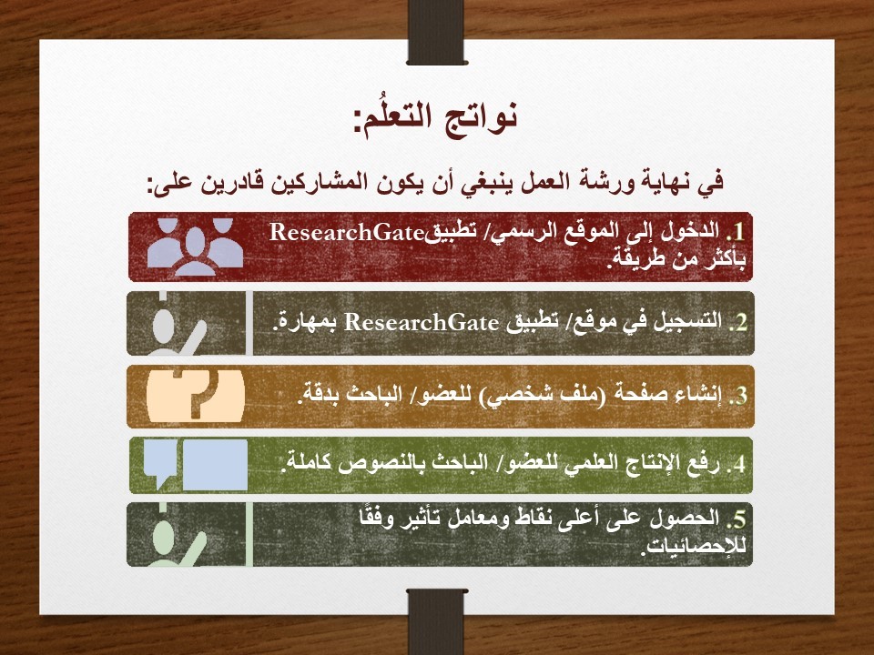 قدمتها الدكتورة/ سحر عبده السيد – رئيسة وحدة البحث العلمي بالكلية- وتهدف الى تنمية مهارات المشاركين في رفع الإنتاج العلمي على بوابة التواصل البحثي ResearchGate.