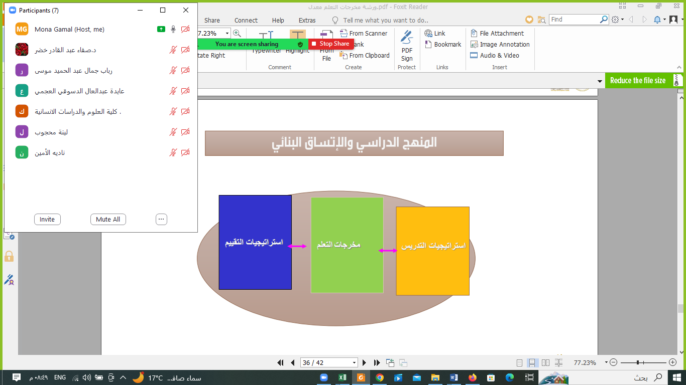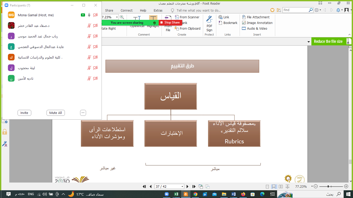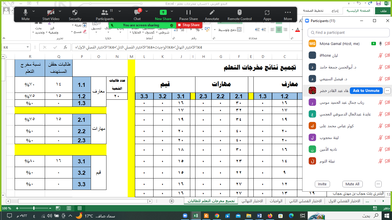 - عرض مثال توضيحي على أحد المقررات و ربط ملفات توصيف المقرر و تقرير المقرر و كذا توضيح ملف اكسل يساعد في حساب مستوى تحقق مخرجات التعلم استنادًا إلى درجات الطالبات و الطلاب في طرق القياس المختلفة.