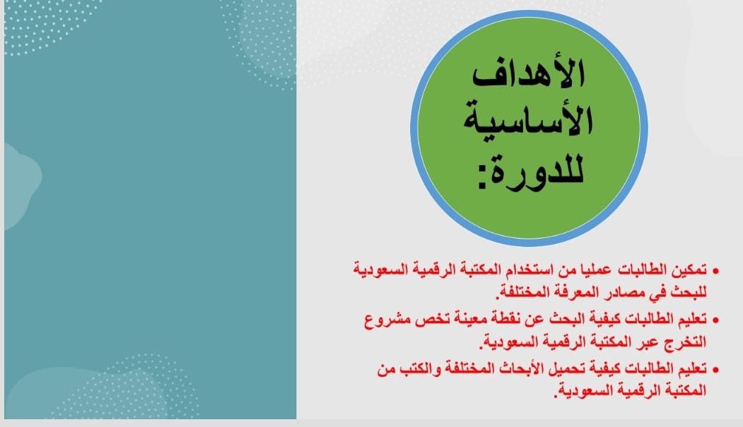 ويهدف البرنامج إلى تمكين الطالبات من استخدام المكتبة الرقمية السعودية للبحث في مصادر المعرفة المختلفة، وأيضا تعليم الطالبات كيفية البحث عن نقطة معينة تخص مشروع التخرج عبرالمكتبة الرقمية السعودية.