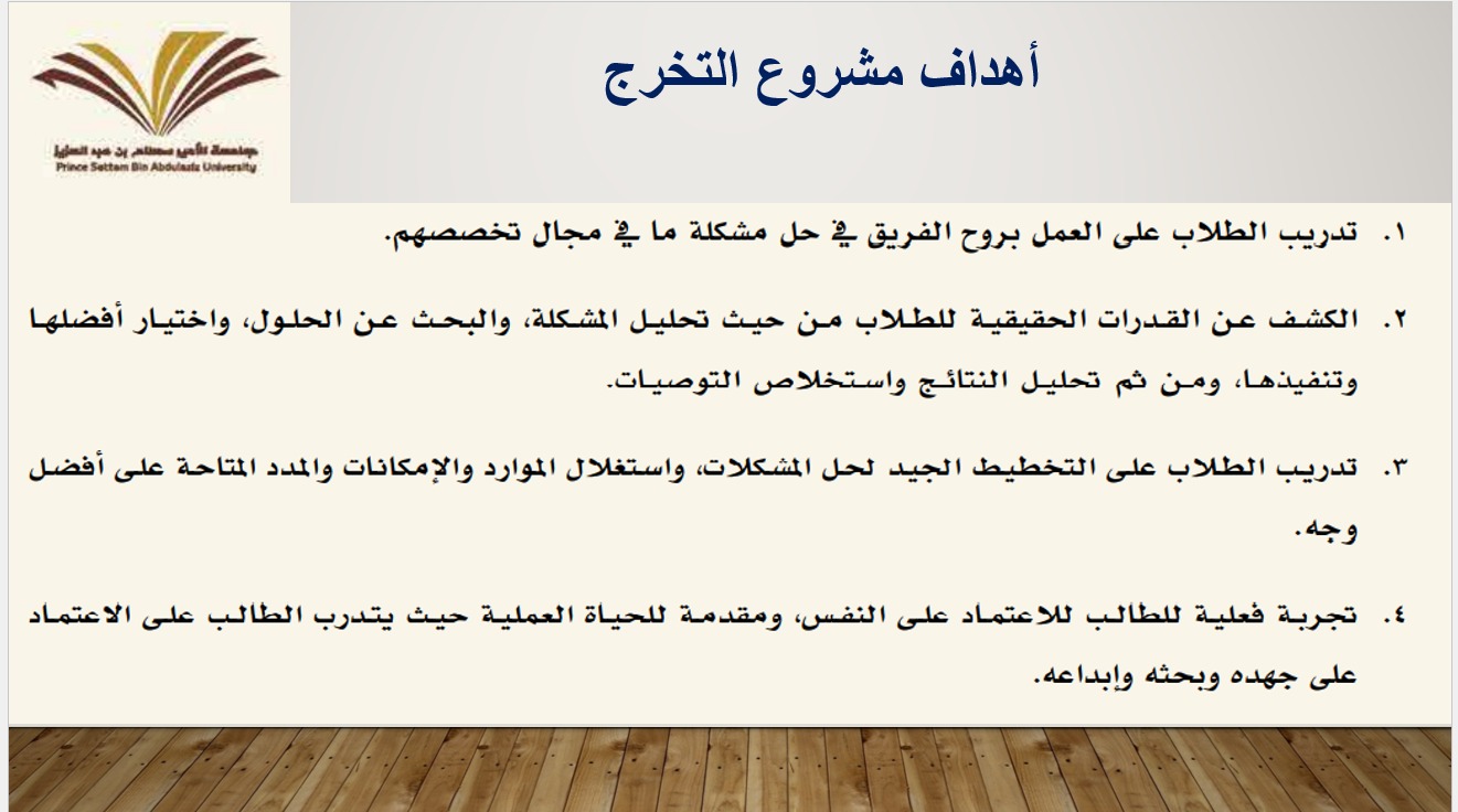 وقد كان اللقاء من إعداد وتقديم الدكتورة سماح عبد الله عبد العظيم أستاذ مساعد بقسم الفيزياء، ومن أهداف البرنامج تعريف الطالبات بماهية مشروع التخرج وأهدافه والجدول الزمني لتنفيذ المشروع وطرق التقييم.