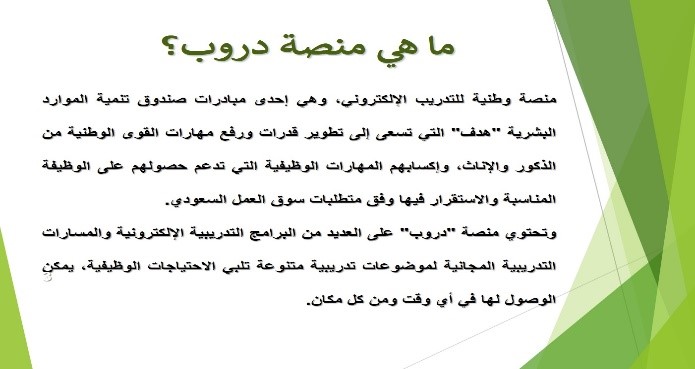 وقد كانت من تقديم الدكتورة إنصاف عامر الفلالي، استاذ مساعد بقسم الكيمياء، وهدفت الدورة للتعريف بمنصة دروب وكيفية الاستفادة من الدورات الإلكترونية المقدمة من قبل هذه المنصة.