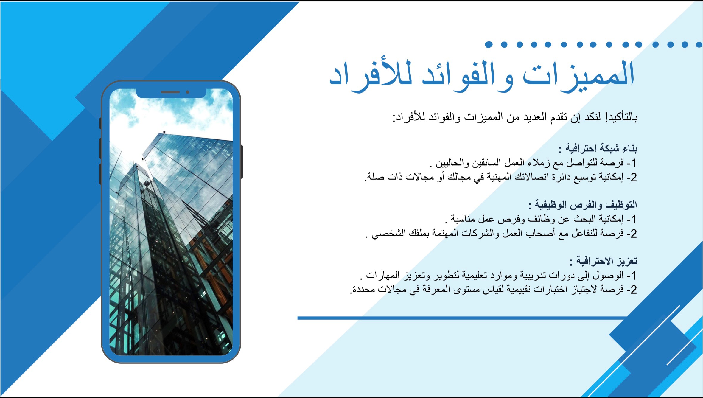 فقد قامت بتقديم الدورة الأستاذة بشاير الدوسري، وكان الهدف من الدورة التدريبية هو التعريف بمنصة LinkedIn وفوائد استخدامها وتطبيق كيفية بناء ملف شخصي احترافي وكيفية التفاعل والتقديم على الوظائف.