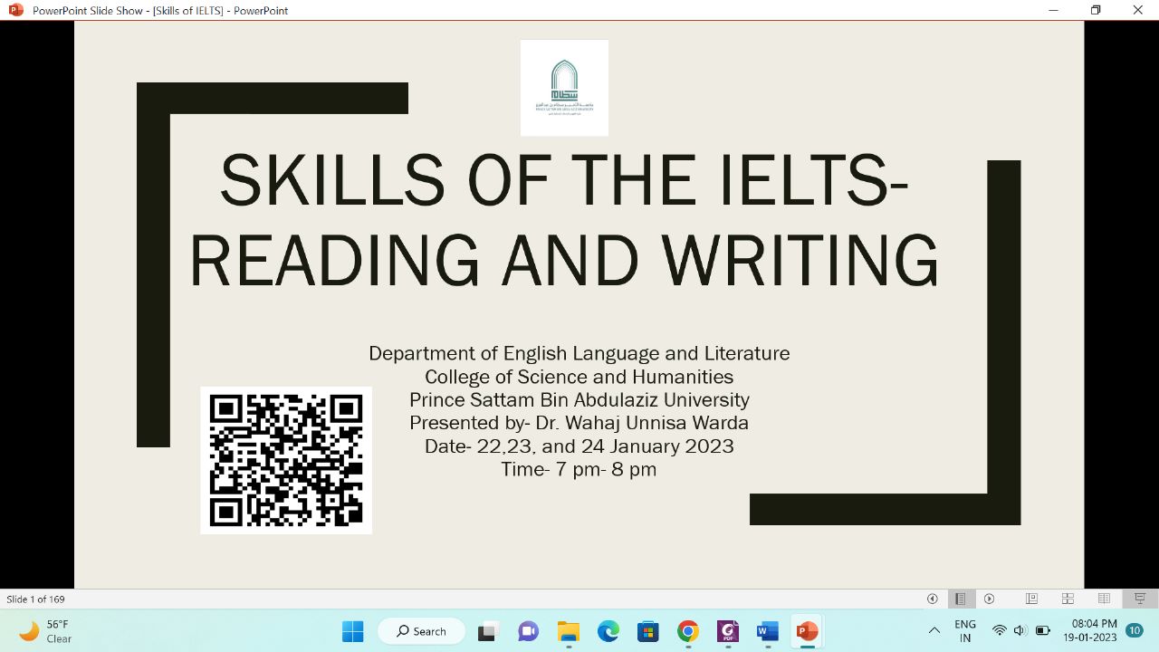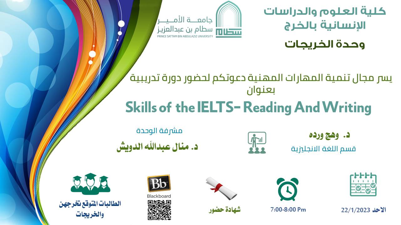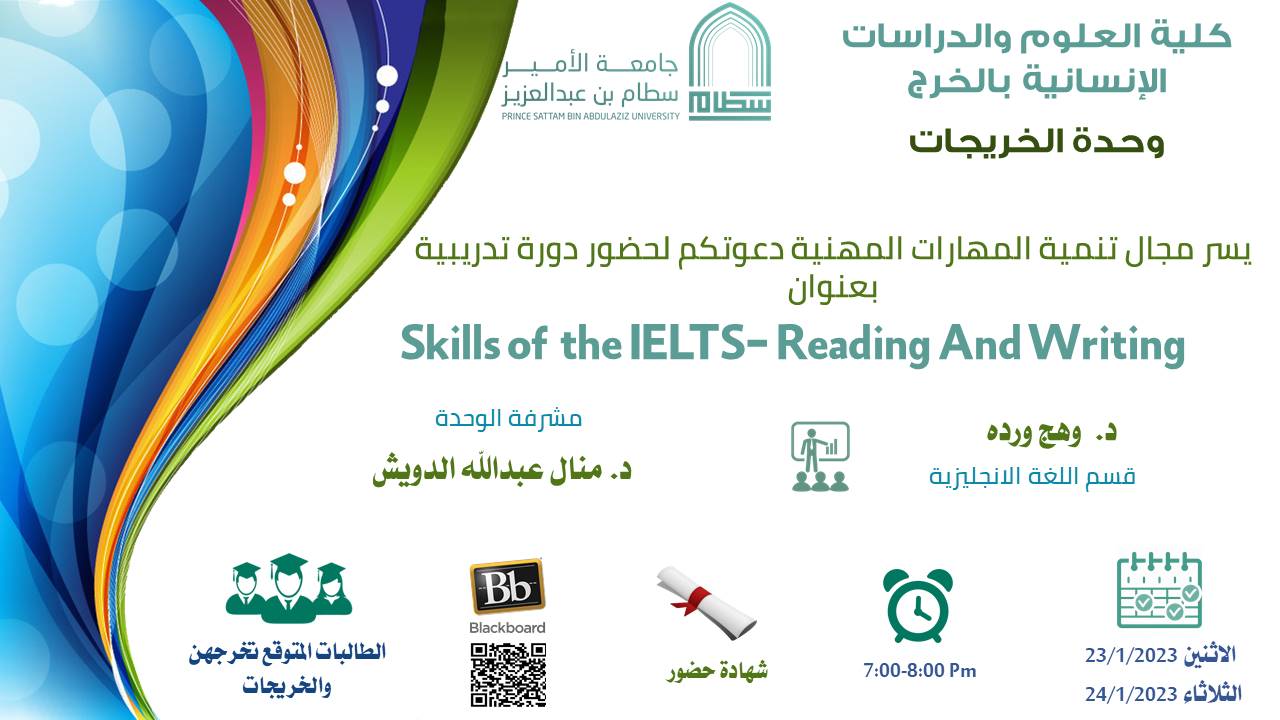 أقامت وحدة الخريجات بكلية العلوم والدراسات الإنسانية بالخرج (أقسام الطالبات) ممثلة في لجنة تنمية المهارات المهنية بعقد برنامج تدريبي عن بعد تحت عنوان (مهارات في اختبار الإيلتس) وذلك لمدة ست أيام من يوم الثلاثاء 17/1/2023م إلى يوم الثلاثاء 24/1/2023م في تمام الساعة الخامسة والنصف إلى الساعة السابعة والنصف مساءًا.