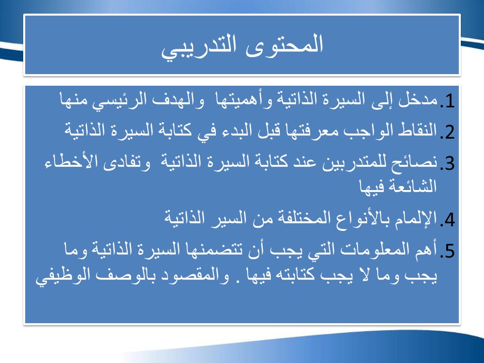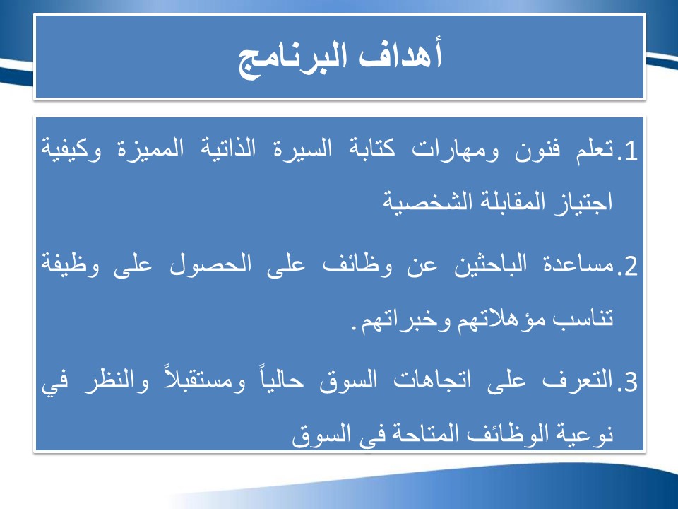 وقد هدفت الدورة : بالتعرف على كيفية كتابة السيرة الذاتية ، وما يجب كتابته فيها ، وما يجب تجنب ذكره كمقدمة للمقابلة الشخصية.