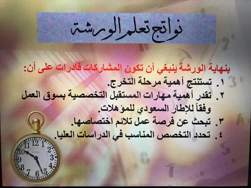 اهتمت الورشة بإثراء مهارات المستقبل التخصصية للخريجة بسوق العمل وفقاً للإطار الوطني السعودي للمؤهلات، من خلال مجالاته، أنواعها، وأهميتها للخريجة- الجامعة- المؤسسات- العالم.
