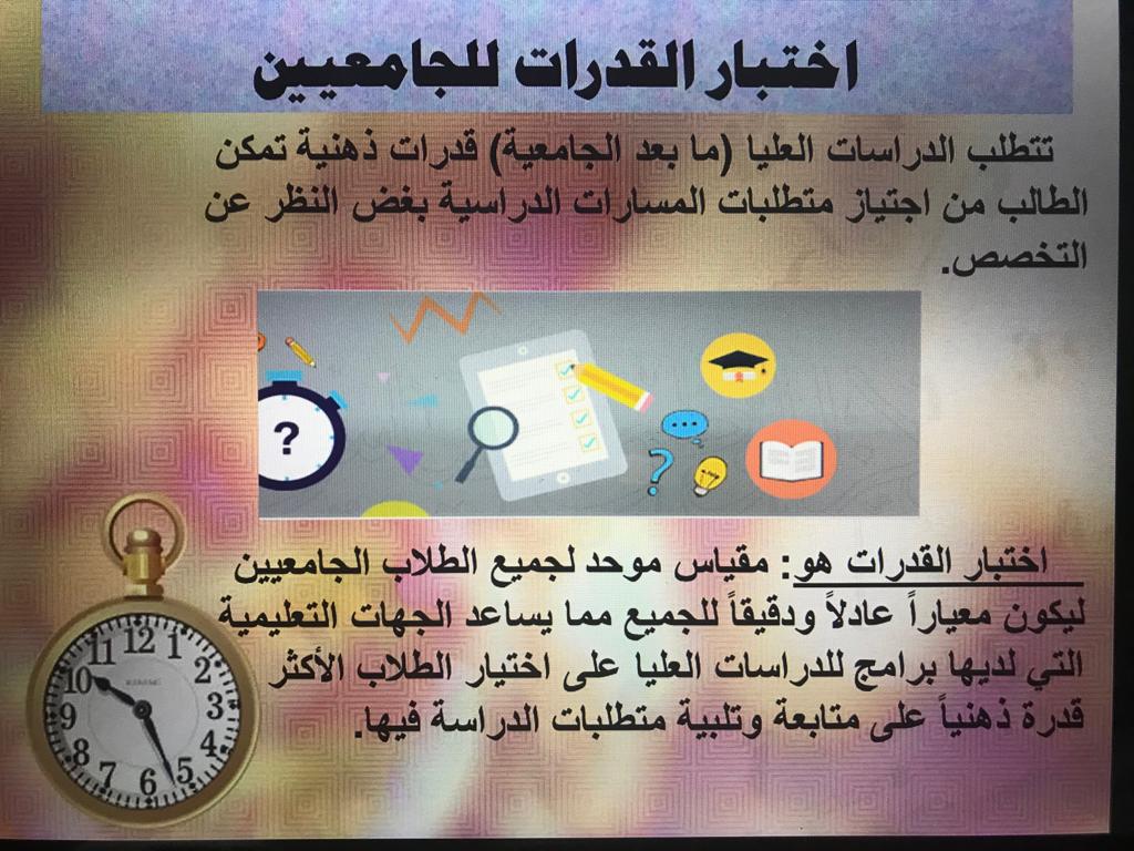 وتم توضيح أهمية اختبار قدرات الجامعيين، والاختبارات اللغوية(STEP) في تأهيل الخريجة للالتحاق بالدراسات العليا.