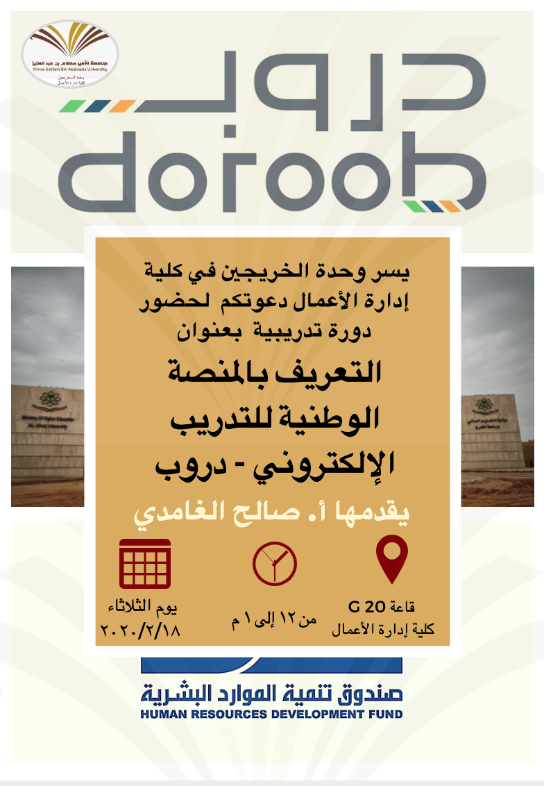 نظمت وحدة الخريجين بكلية إدارة الأعمال يوم الثلاثاء الماضي ورشة عمل بعنوان "المنصة الوطنية للتدريب الإلكتروني - دروب". قدمها سعادة أ. صالح الغامدي، عضو هيئة التدريس بقسم نظم المعلومات الإدارية. هدفت الورشة إلى تعريف الطلاب بالمنصة الوطنية للتدريب الإلكتروني - دروب وما تقدمه من دورات تدريبية مجانية إلكترونية في عدد من التخصصات كإدراة الأعمال, اللغات, التقنية وعلوم الحاسب, المهارات الوظيفية وعدد من التخصصات الأخرى والتي تستهدف طلاب وطالبات الجامعة حديثي التخرج, وذلك مما يعزز في اكتساب المهارات التي تساهم في تحسين فرص المواطنين الوظيفية وتأهيلهم لسوق العمل، وشهاداتها تعد إضافة قوية للسيرة الذاتية. وبذلك وجه مقدم الورشة طلاب وطالبات الجامعة لأهمية التسجيل والمشاركة في مثل هذه الدورات الإلكترونية مما يدعم فرصهم الوظيفية مستقبلاً في القطاع الحكومي والقطاع الخاص.