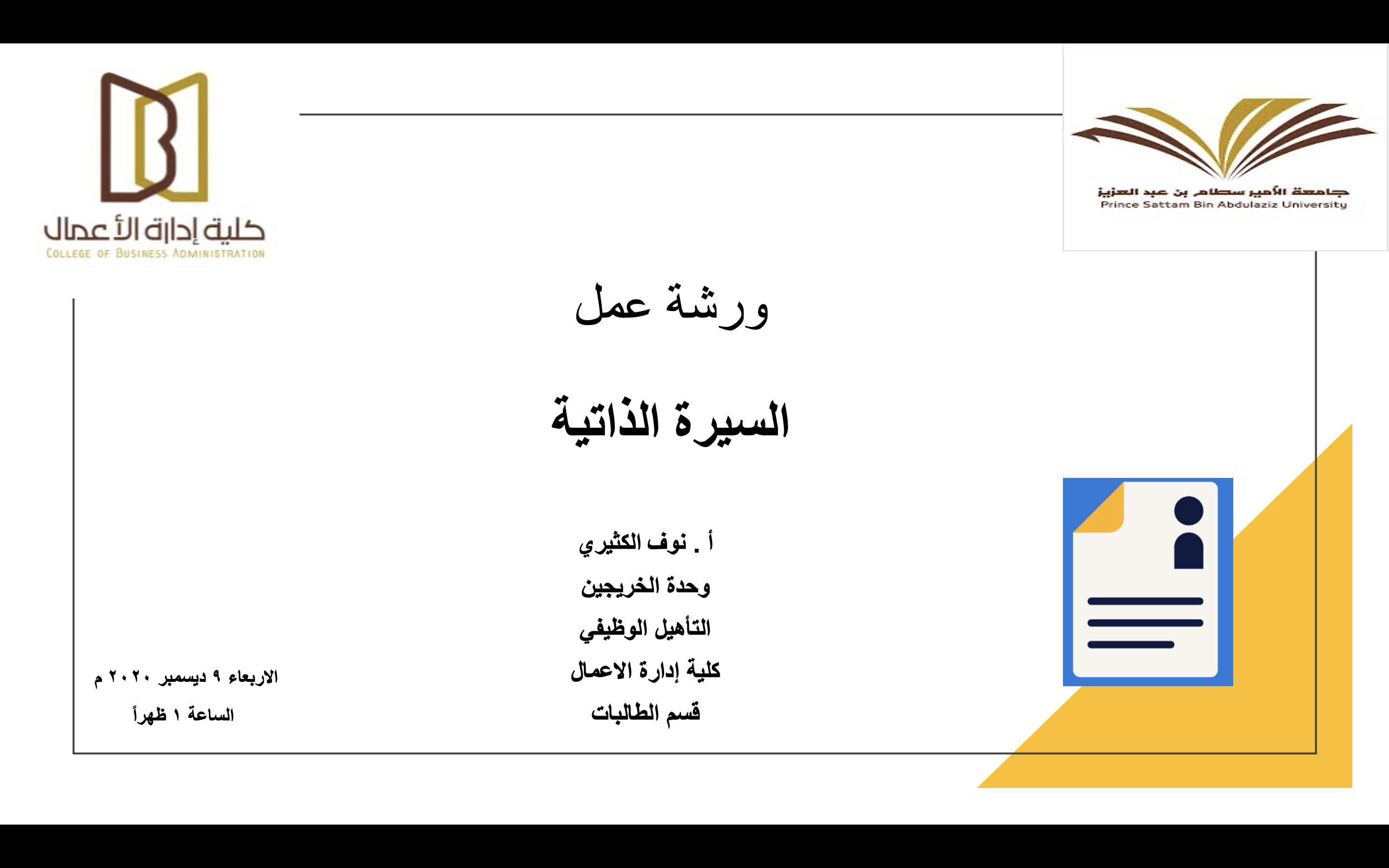 أقامت وحدة الخريجين بكلية إدارة الاعمال بالخرج ممثلة بوحدة التأهيل الوظيفي ورشة عمل " السيرة الذاتية " اليوم الاربعاء بتاريخ ٢٤ ربيع الثاني ١٤٤٢ هـ الموافق ٩ ديسمبر ٢٠٢٠ م الساعة الواحدة ظهراً, وقد قدمت ورشة العمل الأستاذة نوف راشد الكثيري عبر برنامج زوم. وقد هدفت ورشة العمل إلى تعريف الطالبات بمهارات كتابة السيرة الذاتية قبل البحث عن الوظائف, وكيفية تفادي الأخطاء الشائعة التي من شانها ان تقلل من الحصول على فرصة العمل.