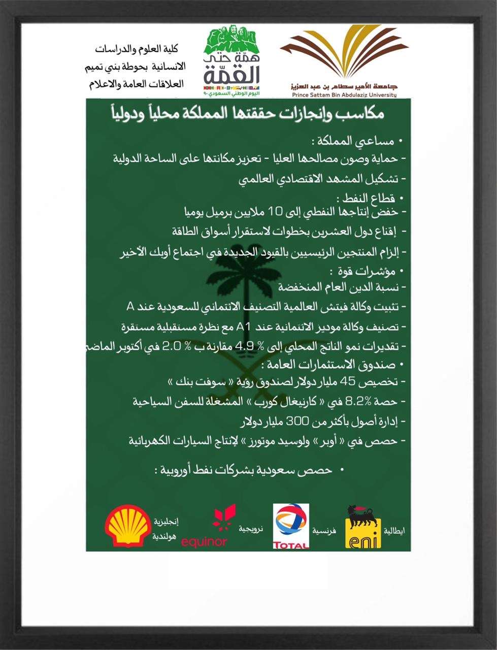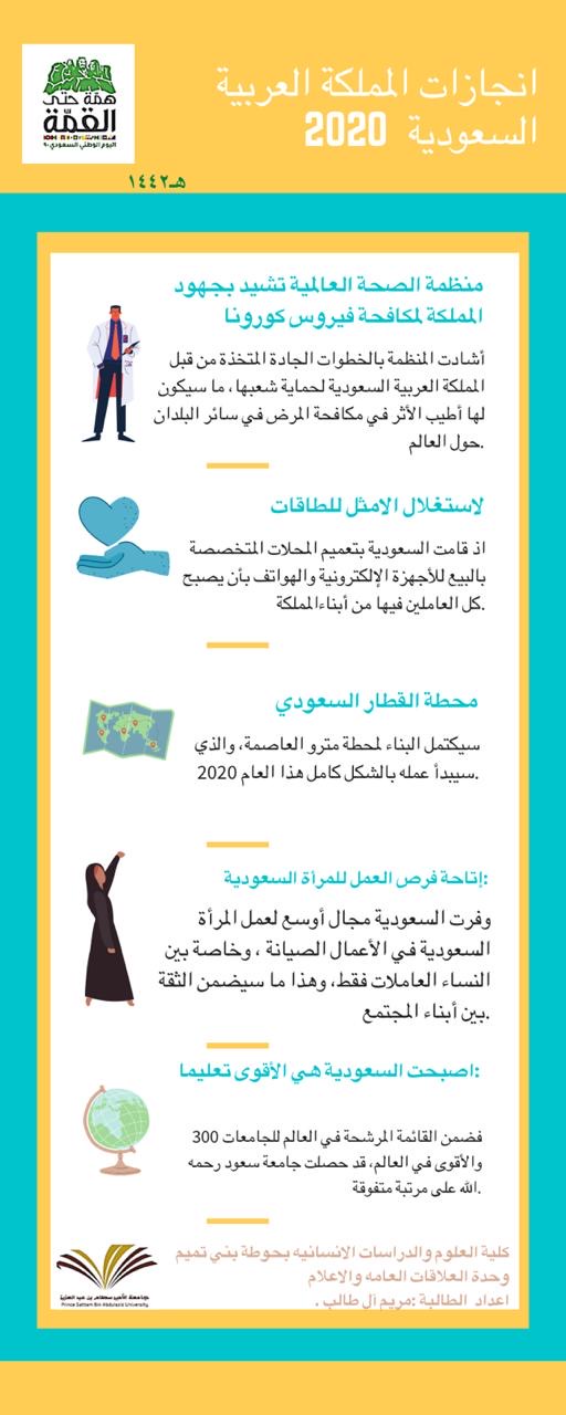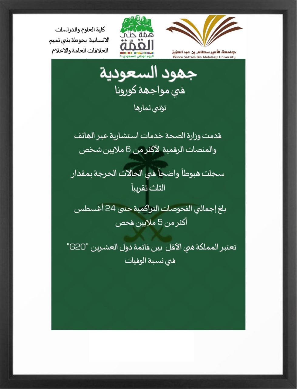في اليوم الثالث والعشرين من سبتمبر تتجدد مشاعر الحب والعطاء ويحتفل الشعب السعودي بانتمائهم الوطني، ومن هذا المنطلق وتحت قيادة عميدة كلية العلوم والدراسات الإنسانية بحوطة بني تميم د. حصة بنت سعود الهزاني. أقامت وحدة العلاقات العامة بالكلية تحت إشراف أ/ مها الصقعبي بالتعاون مع طالبات قسم نظم معلومات تحت إشراف أ/ نورة الشهراني. مشاركة افتراضية عن بعد مونتاج، في يوم الثلاثاء الموافق: 1442/2/5هـ. وذلك تماشيا مع الإجراءات الاحترازية لمواجهة فيروس كورونا، بدأ العرض بالسلام الملكي بعدها بطاقة تهنئة لمقام خادم الحرمين الشرفين الملك سلمان بن عبد العزيز آل سعود وولي عهدة الأمين، كما احتوى العرض على تصاميم منشورات لطالبات قسم نظم المعلومات تناولن فيها انجازات المملكة العربية السعودية 2020، وجهود المملكة في مواجهة كورونا، ومكاسب وإنجازات حققتها المملكة محلياً ودولياً، كذلك تصميم منشورات تهمك تحتوى على أرقام تخدم المواطن والمقيم مثل أرقام الشرطة والاسعاف والاطفاء وغيرها. أيضاً تصاميم خلفيات جوال تعبر عن اليوم الوطني. في الختام ستظل ذكرى اليوم الوطني السعودي في كل عام من أهم الأيام التي يفخر بها المواطن السعودي لشعوره بالأمن والأمان بفضل الله سبحانه وتعالى أولًا ثم بجهود حُكامها.