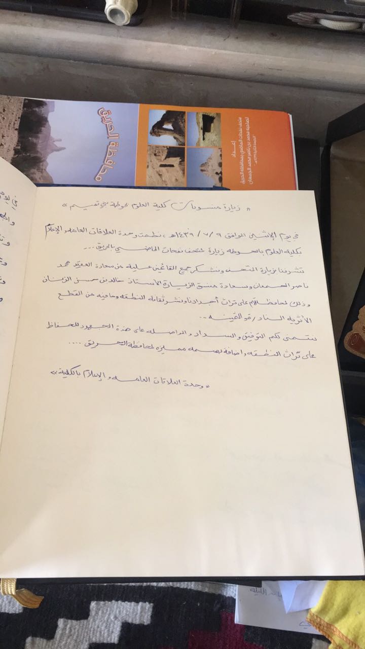 كان ذلك في يوم الأثنين الموافق ٩/ ٧ / ١٤٣٩ هـ عند الساعة العاشرة صباحاً، حيث توجهن منسوبات الكلية من الطالبات والأستاذات إلى المتحف الأثري التابع لمحافظة الحريق في رحلة استغرقت ثلاثين دقيقة. تم الاستقبال والتعريف بمرافق المتحف وما يحتوي من مقتنيات ثمينة عن طريق منسقات الزيارة من عائلة الزنان. وفي نهاية الزيارة تقدمن منسوبات وحدة العلاقات والإعلام بالشكر والتقدير لصاحب المتحف سعادة العقيد محمد بن ناصر الجمعان وسعادة المشرف عليه الأستاذ خالد بن حسن الزنان على جهودهم في الحفاظ على التراث واضافة بصمة مميزة لمحافظة الحريق وإتاحة الفرصة لمنسوبات الكلية بزيارة المتحف سائلين الله لهم التوفيق والسداد.