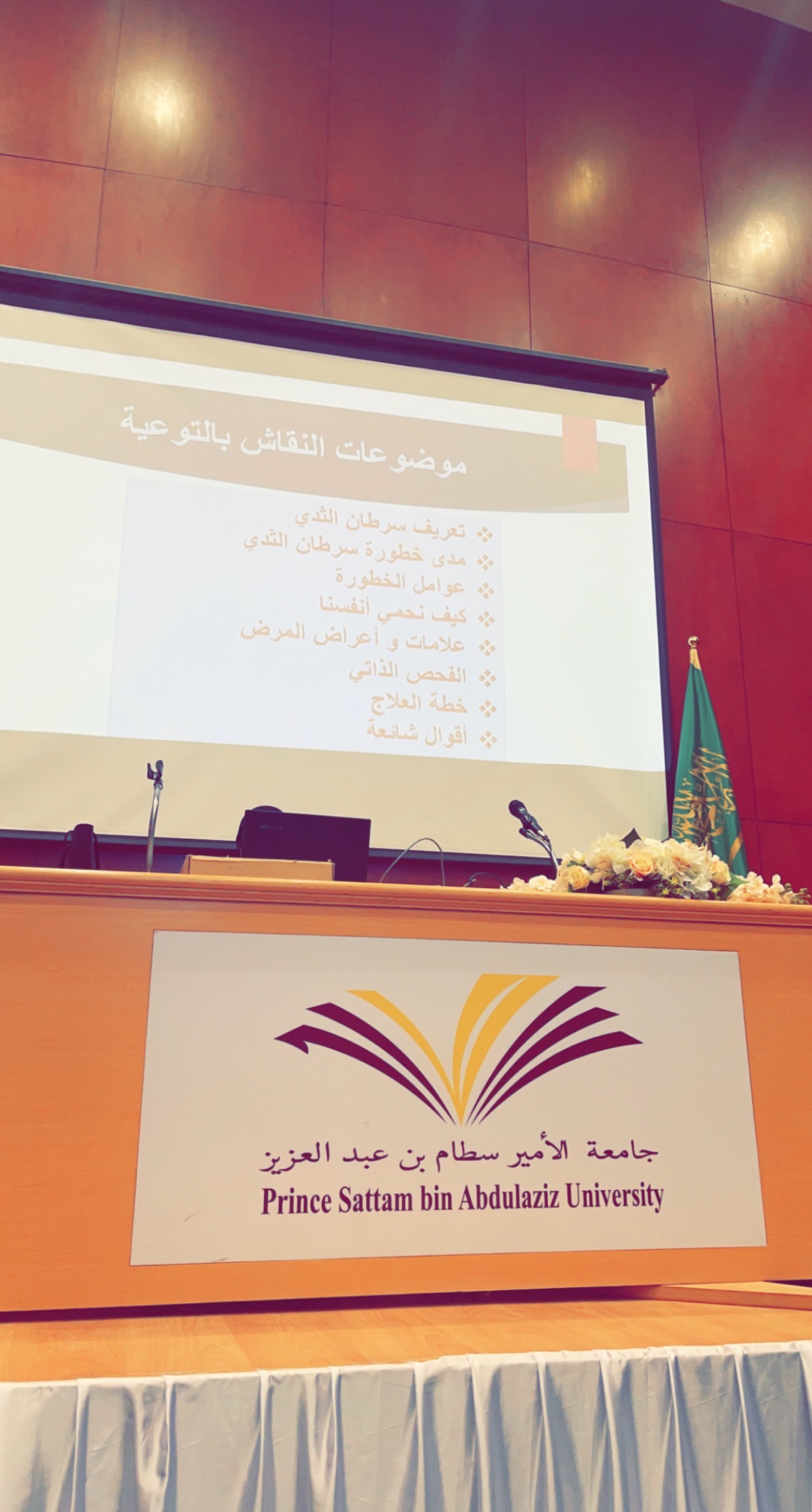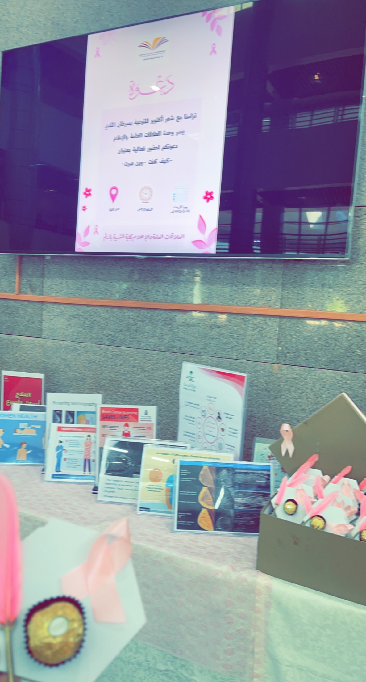 "تزامنا مع شهر أكتوبر العالمي للتوعية بسرطان الثدي حسب منظمة الصحة العالمية" استضافت الكلية ممثلةً بوحدة العلاقات العامة والاعلام يوم الأربعاء الرابع عشر من شهر ربيع الأول لعام 1443هـ فريق من مستشفى الأمير سلمان بن محمد بالدلم لتفعيل الحملة تثقيفية والتي بعنوان "كيف-كنت –وين صرت " والمنفذة في بهو الكلية وتهدف الى: