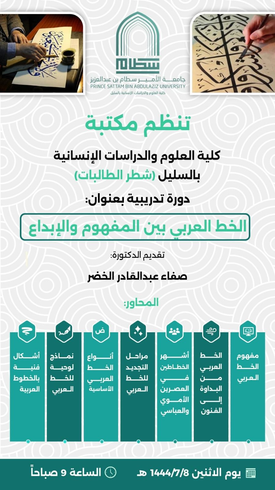 نظمت وحدة المكتبة في كلية العلوم والدراسات الإنسانية بالسليل (قسم الطالبات) ، دورة تدريبية بعنوان " الخط العربي بين المفهوم والإبداع " وذلك في يوم الأثنين 1444/7/8هـ عند الساعة 9 صباحاً.