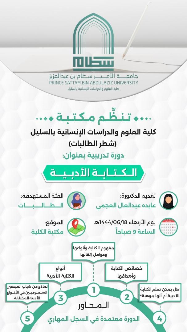 أقامت وحدة المكتبة في كلية العلوم والدراسات الإنسانية بالسليل (شطر الطالبات) دورة تدريبية بعنوان " الكتابة الأدبية " وذلك في يوم الأربعاء 18/6/1444هـ عند الساعة 9 صباحاً . وقد حضر الدورة عدداً من منسوبي الكلية من طالبات وإداريات وأعضاء هيئة التدريس، وقدمتها الدكتورة / عايده عبدالعال العجمي.