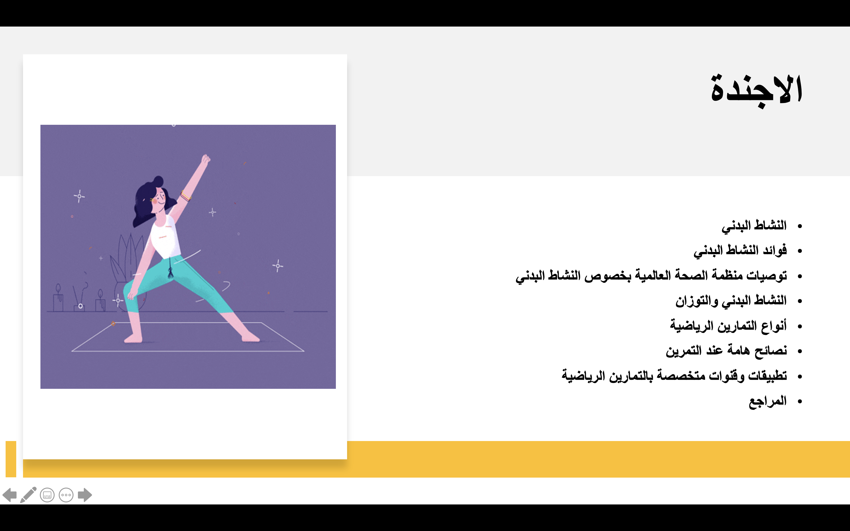نظمت وحدة العمل الطلابي بكلية إدارة الاعمال بالخرج ممثلة بوحدة الأنشطة الرياضية محاضرة " أسلوب الحياة الصحي " اليوم الاثنين ٧ ديسمبر ٢٠٢٠ م الموافق ٢٢ ربيع الثاني ١٤٤٢هـ الساعة الواحدة ظهراً, وقدمت المحاضرة من قبل الأستاذة نوف راشد الكثيري عبر برنامج زوم. وهدفت المحاضرة إلى التعريف بالنشاط البدني وفوائده والتأكيد على أهميته لجميع الفئات العمرية، و معرفة معادلة التوازن لتحقيق حياة صحية تتناسب مع اهداف الفرد الشخصية وكذلك التعريف بأنواع مختلفة من التمارين الرياضية مع إعطاء امثلة واقعية, وكذلك العمل على مشاركة اهم النصائح لتحقيق السلامة اثناء التمارين, كما تم أيضا مشاركة بعض البرامج والتطبيقات المتخصصة بالتمارين الرياضية.