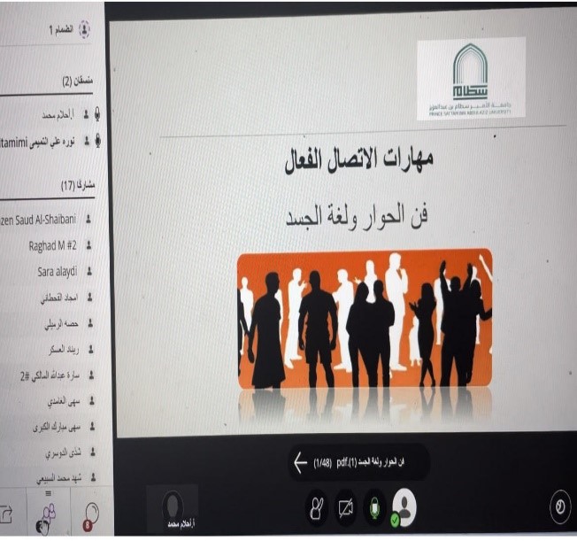 قدمتها الأستاذة/ أحلام القحيز، بهدف: اكساب المشاركات المهارات الأساسية اللازمة للقدرة على التحدث والمخاطبة ومواجهة الجمهور وجذبهم بطرق الحوار المختلفة ولغة الجسد، وذلك من خلال: