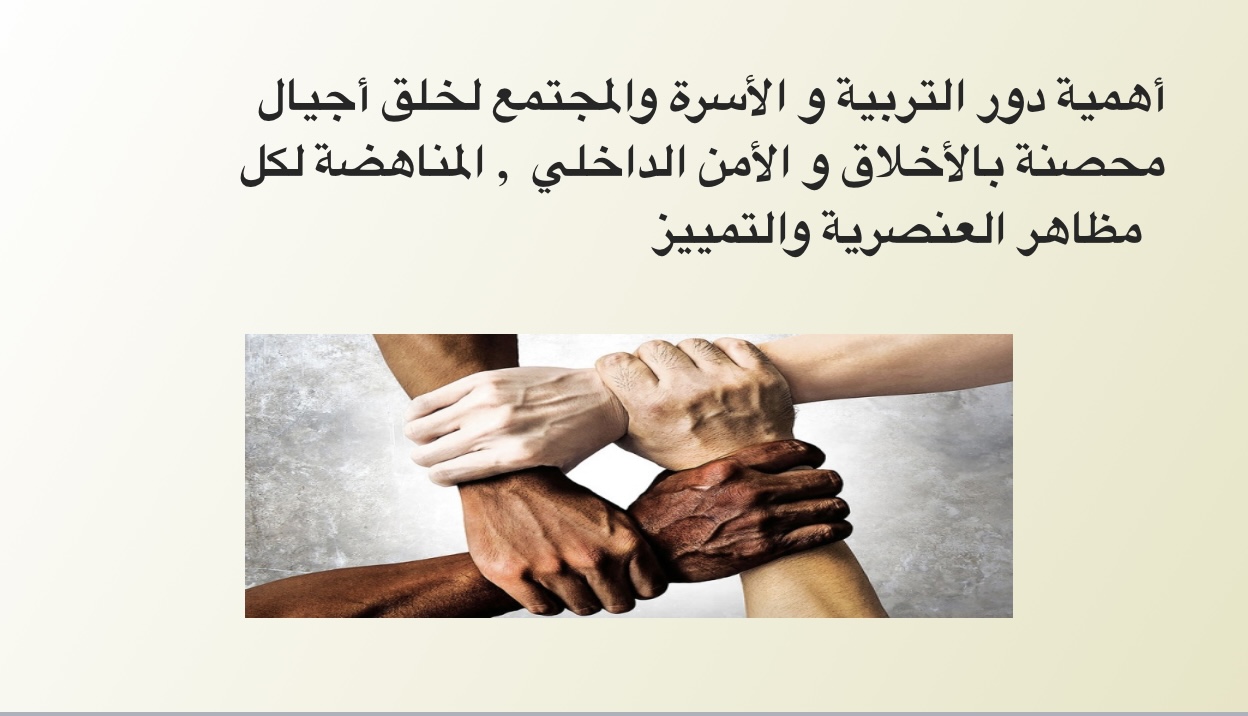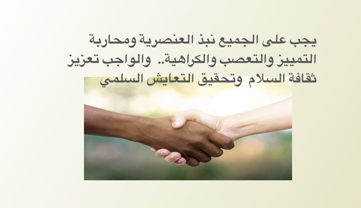 حيث القت الأستاذة/نورة التميمي- محاضرة تناولت فيها التعريف بالأخوة الإنسانية وبثقافة السلام وتعزيزها وأهمية الحوار وقيم التسامح في الإسلام للوصول الى التعايش السلمي، ودور التربية والأسرة والمجتمع لخلق أجيال محصنة بالأخلاق والأمن الداخلي لمقاومة ومناهضة كل مظاهر العنصرية والإرهاب والتمييز، واحترام الحياة وإنهاء العنف من خلال التعليم والحوار والتعاون واﻻحترام الكامل لجميع حقوق اﻹنسان والحريات اﻷساسية وتعزيزها ونبذ العنصرية والتنمر ومحاربة التمييز والتعصب والكراهية.