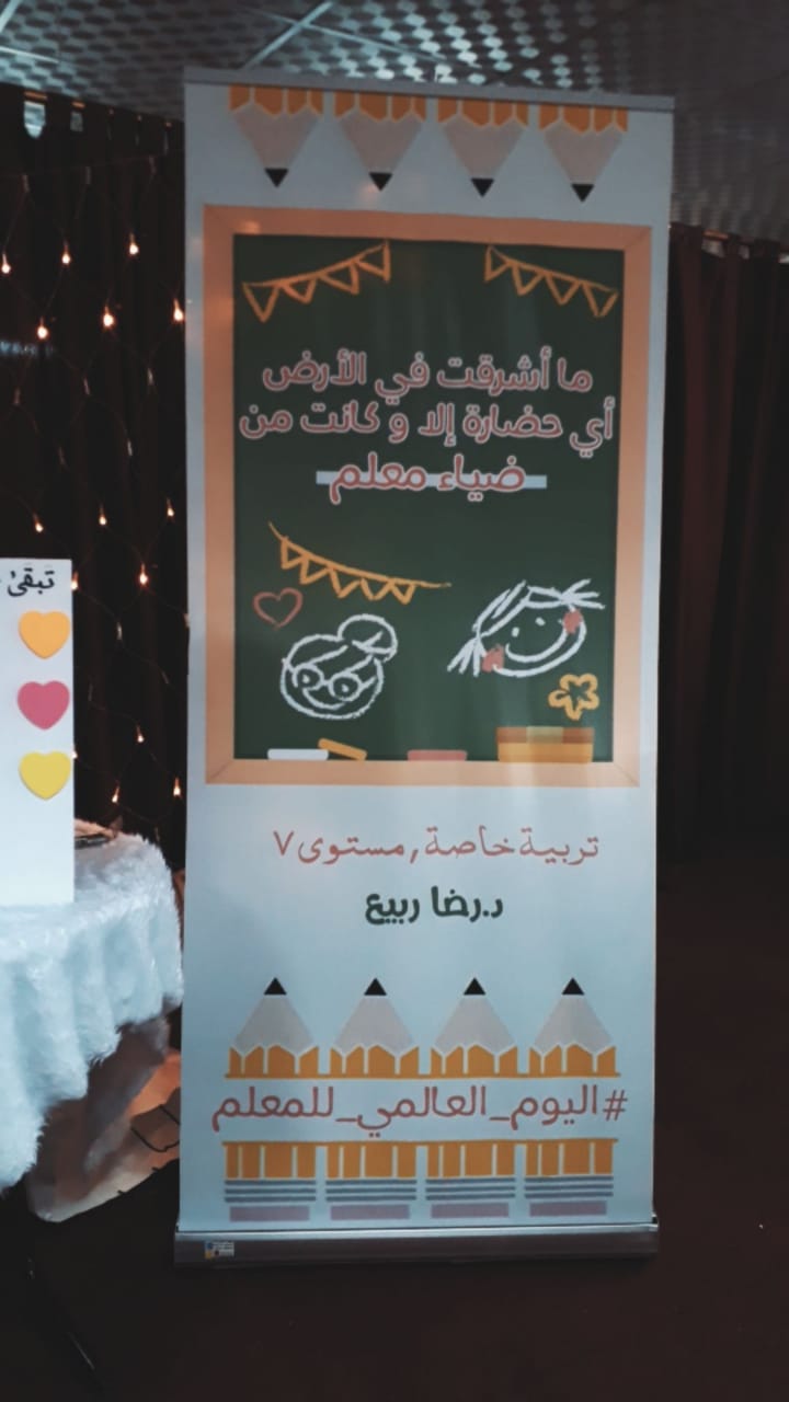 انطلاقا من الخطة الاستراتيجية لوزارة التعليم في دعم المعلم والمعلمة مهنيًا ؛ وإيمانًا من الكلية بأهمية التفاعل مع كل المناسبات ذات العلاقة برؤيتها ورسالتها وأهدفها الاستراتيجية وبما يسهم في تحقيق رؤية المملكة 2030 فيما يخص بناء الإنسان والثرة البشرية وتزامنا مع الاحتفال باليوم العالمي للمعلم نظمت وحدة العمل الطلابي متمثلة في الأنشطة الثقافية والاجتماعية احتفالية باليوم العالمي للمعلم يوم الخميس الموافق 12/2/1441هـ قدمتها د/رضا ربيع عبد الحليم وطالبات قسم التربية الخاصة، وهدفت الاحتفالية إلى:-