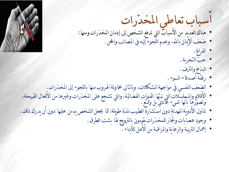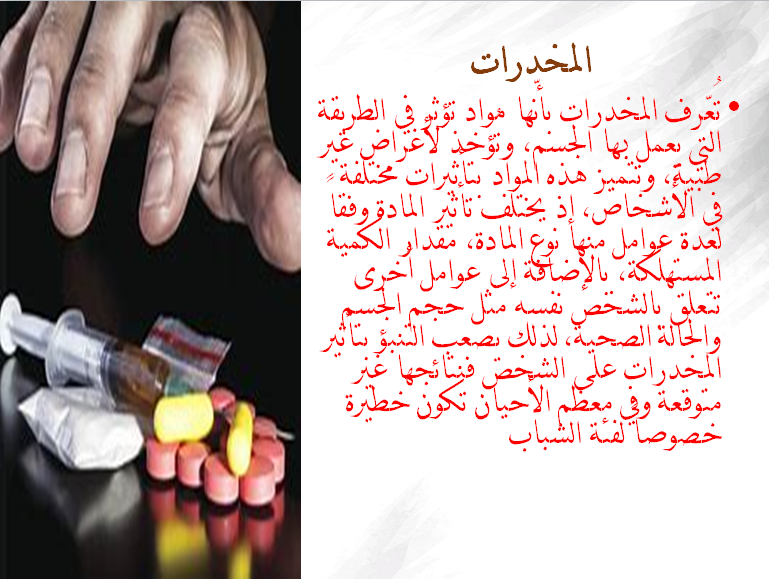وقد تضمنت الورشة عدة موضوعات بالشرح والمناقشة تناولت فيها المقدمة عن أسباب التعاطي وكيف تكتشف الأسرة الشخص المدمن والتغييرات والاثار الجانبية الظاهرة على المدمن و أضرار المخدرات على الفرد والأسرة والمجتمع والاثار الناتجة من مخاطر ومشكلات من الناحية الصحية والاجتماعية والنفسية والاقتصادية والامنية ، كما وضحت العقاقير بأنواعها الطبيعية والمصنعة ومدى الضرر المترتب على تعاطيها ودور المملكة في درء هذه الظاهرة متمثلة في تضافر الجهات ذات الصلة وتكاتفها لايجاد الحلول الجذرية لاستئصالها .