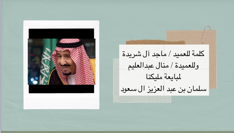 برعاية سعادة عميد الكلية الدكتور/ ماجد الشريدة ،أقامت وحدة العمل الطلابي ومشرفة الوحدة سعادة الدكتورة / مروة أبوالفضل - بكلية التربية بوادي الدواسر ـ قسم الطالبات ـ في يوم الأربعاء الموافق18/11/2020 م احتفالاً بالذكرى السادسة لبيعة خادم الحرمين الشريفين الملك سلمان بن عبدالعزيز آل سعود حفظه الله عن طريق برنامج زووم . بإشراف سعادة الدكتورة/ غادة فرغل جابر