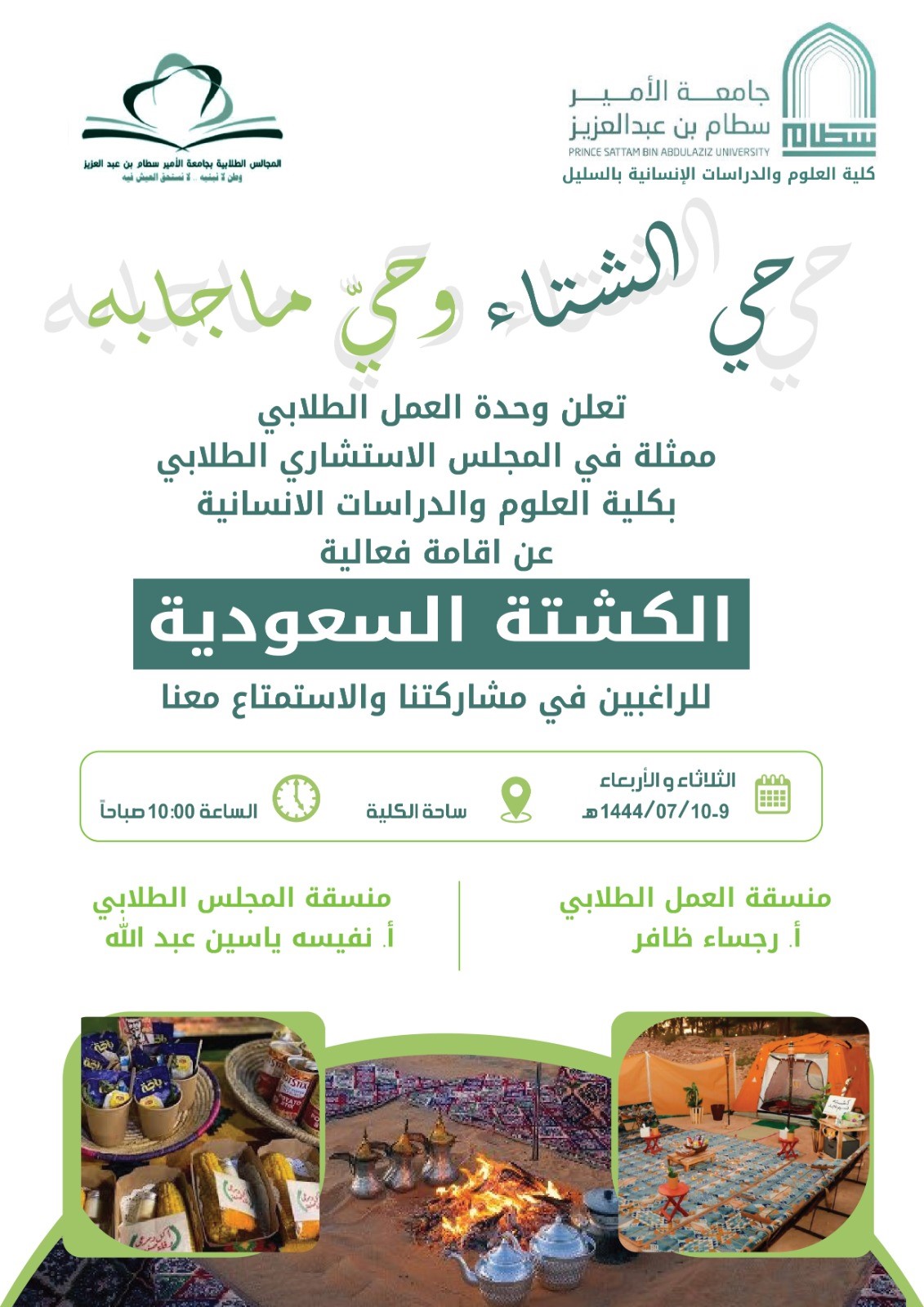 نظمت وحدة العمل الطلابي متمثلة في المجلس الاستشاري للمجلس الطلابي فعالية الجلسة الشتوية كفعالية ترفيهية لما لهذه الأنشطة من أهمية في تجديد طاقة العمل وتعزيز العلاقة مع الطالبات لبعضهن البعض وكذلك مع الهيكل التعليمي والأداري بالكلية ، والتي امتدت من الثلاثاء الموافق.7/9/ 1444هـ ، حتى الأربعاء 1444/7/10هـ تحت شعار "رجع الشتاء و رجعت ليالينا معكم".