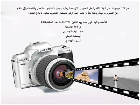 تحت إشراف وحدة رعاية الموهوبات بعمادة السنة التحضيرية – شطر الطالبات يوم الاثنين الموافق 20/7/1438هـ أُقيم اللقاء التعريفي بركن التصوير الفوتوغرافي بوحدة الموهوبات بتنظيم كلاً من أ. نوف الجعيدي و أ. سهاد الهويدي و أ. بسمات علي. كما حضر هذا اللقاء العديد من الطالبات ومنسوبات العمادة.