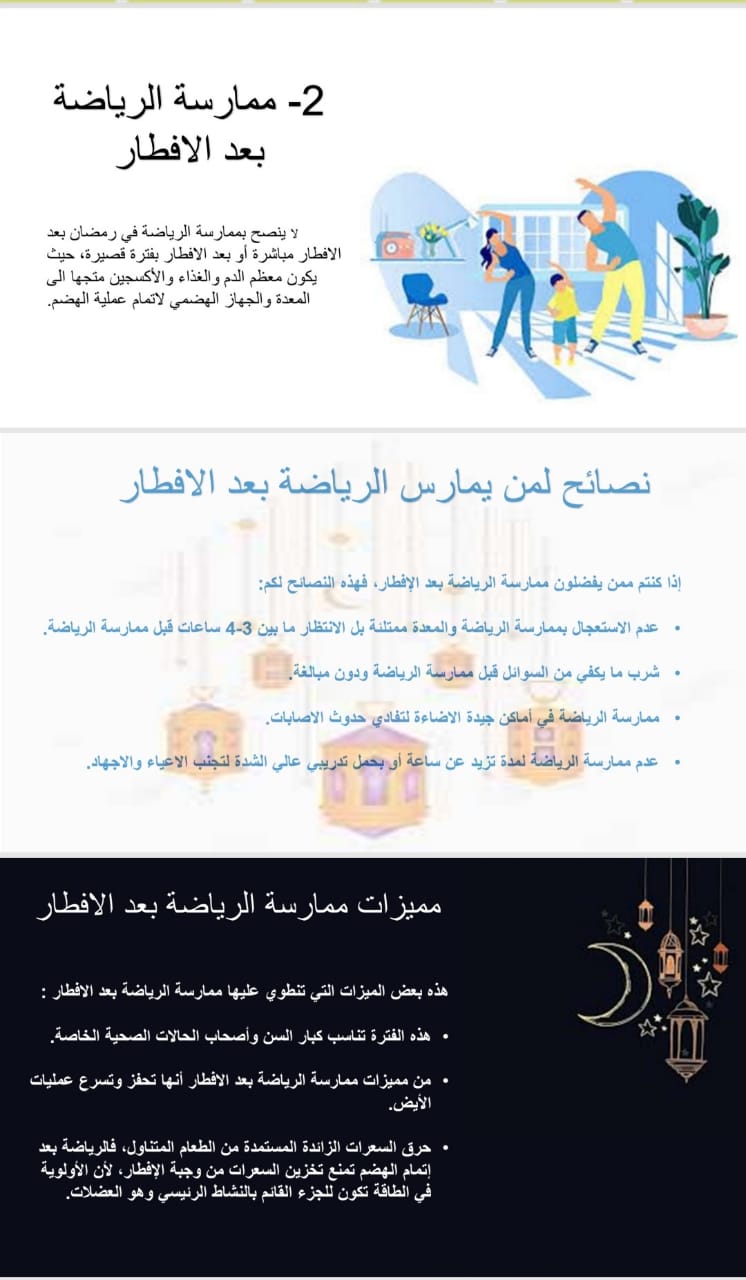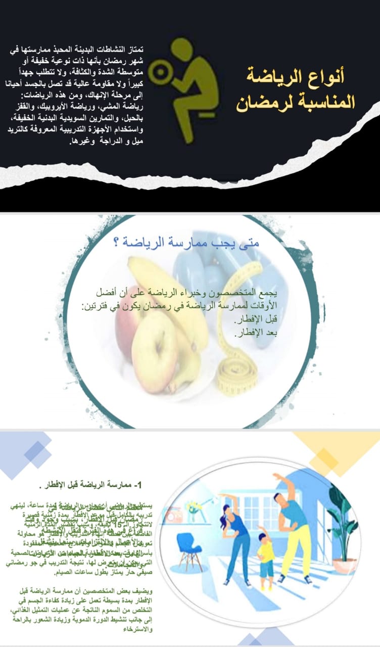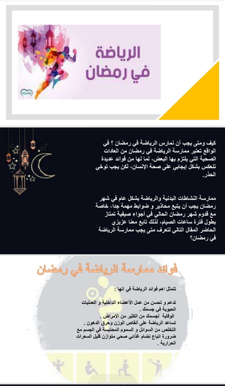 (تعتبر ممارسة الرياضة في شهر رمضان المبارك من العادات الصحية التي تنعكس بشكل إيجابي على صحة الإنسان، لكن يجب أن يتبع ممارسها محاذير وضوابط مهمة جدًا)، لذا أقامت وحدة النشاط الرياضي تحت رعاية سعادة عميدة كلية العلوم والدراسات الإنسانية بحوطة بني تميم الدكتورة/ حصة بنت سعود الهزاني، برنامجًا بعنوان(الرياضة في رمضان)، وذلك في يوم الثلاثاء الموافق: ١٧ / ٨ / ١٤٤٢هـ، في تمام الساعة الرابعة مساءً، بحضور عددٍ من أعضاء هيئة التدريس والطالبات، عبر برنامج البلاك بورد.