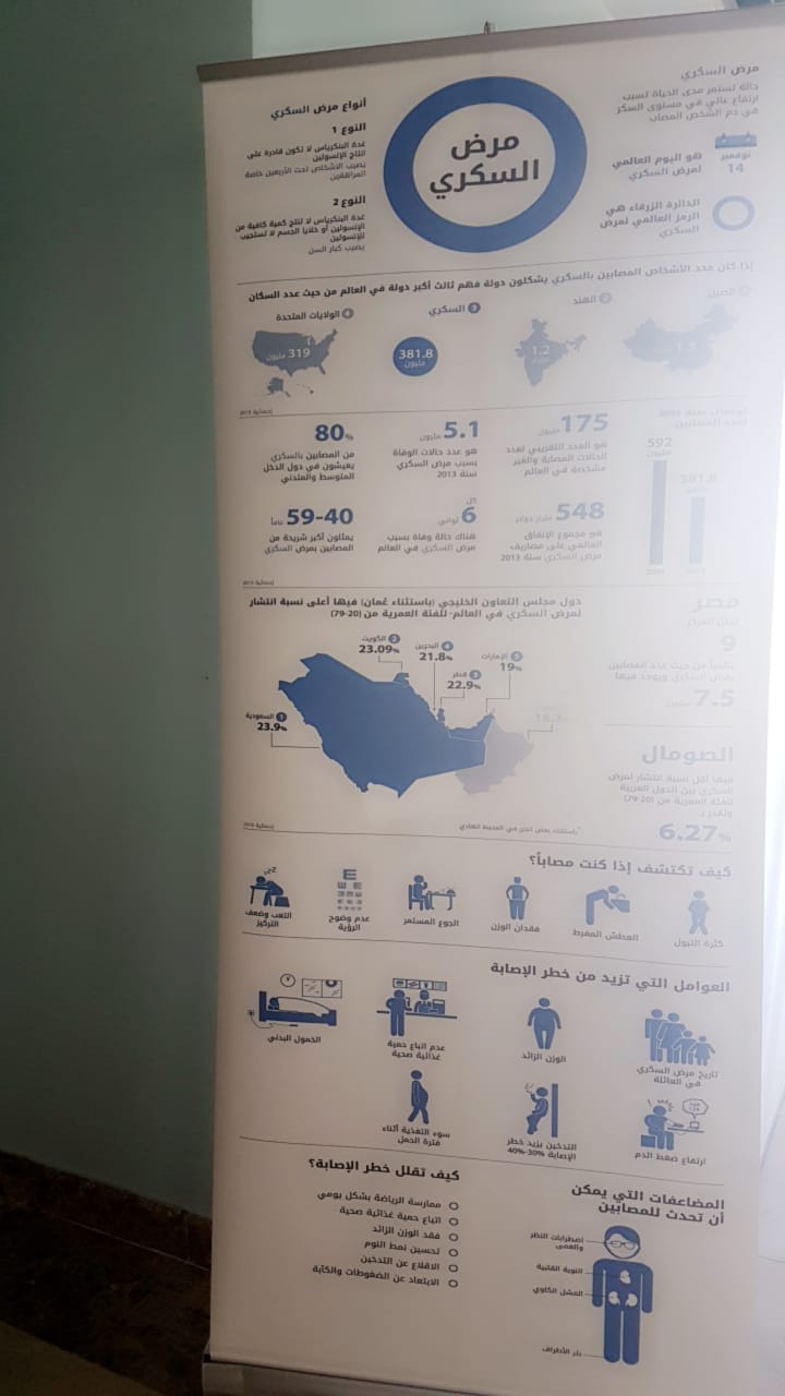 احتوى النشاط على توزيعات ومنشورات عن التوعية بمرض السكري واهمية الغذاء الصحي ونصائح لمرضى السكري.