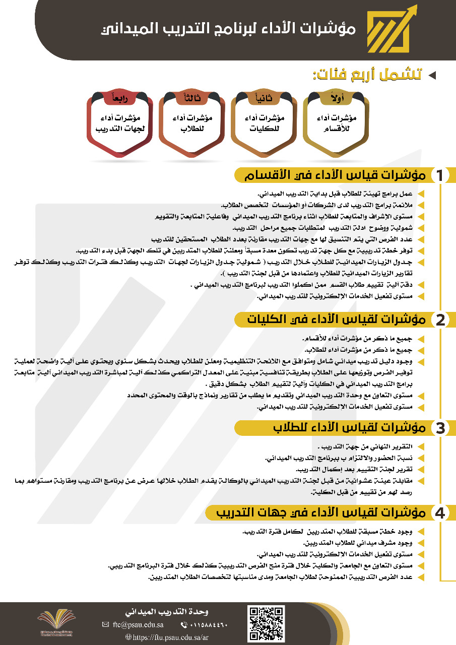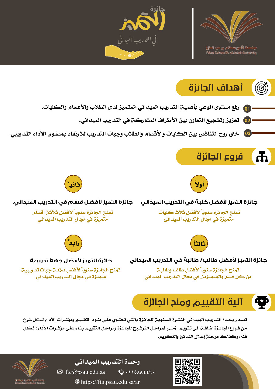 اعتمد وكيل الجامعة للشؤون التعليمية والأكاديمية سعادة الدكتور عبدالرحمن بن إبراهيم الخضيري اطلاق جائزة التميز للتدريب الميداني بفروعها الأربعة والتي تشمل الكليات والأقسام والطلاب والطالبات وجهات التدريب , كذلك تم اعتماد وتعميم مؤشرات تقييم الأداء لبرامج التدريب الميداني في كل فرع من فروع الجائزة.