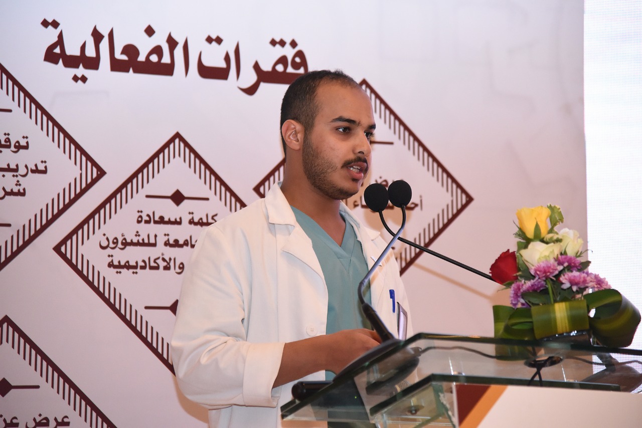 عقب ذلك ألقى وكيل الجامعة للشوؤن التعليمية والأكاديمية سعادة الدكتور: عبدالرحمن بن ابراهيم الخضيري كلمة بهذه المناسبة رحب فيها بالجميع، وعبر فيها عن شكره وعظيم امتنانه لما تلقاه البرامج التعليمية والأكاديمية من دعم مستمر من معالي مدير الجامعة . كما قدم شكره لجهات التدريب ودورهم الفعال في تهيئة طلاب الجامعة لمتطلبات العمل عبر توفير فرص نوعية ذات علاقة مباشرة بتخصصات الطلاب، وثمن لهم جهودهم في توفير بيئة تدريب متطورة تساعد الطلاب على اكتساب كل المهارات الضرورية للعمل الميداني والمهني بعد التخرج .