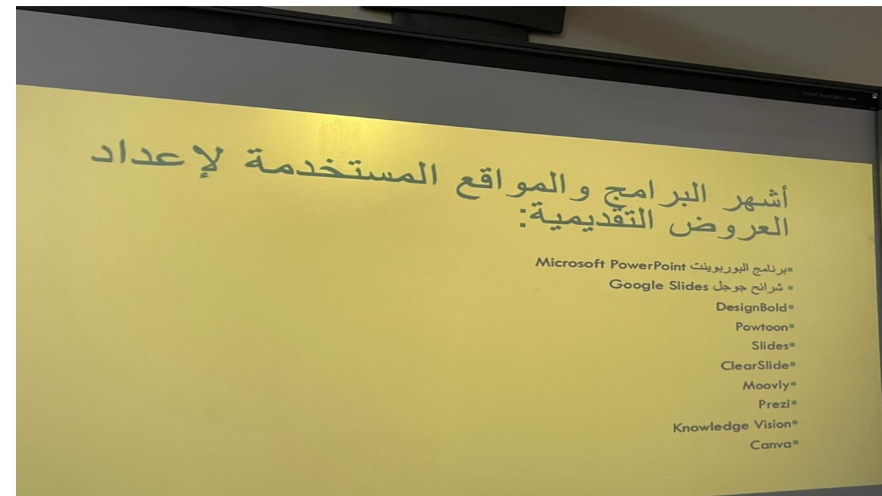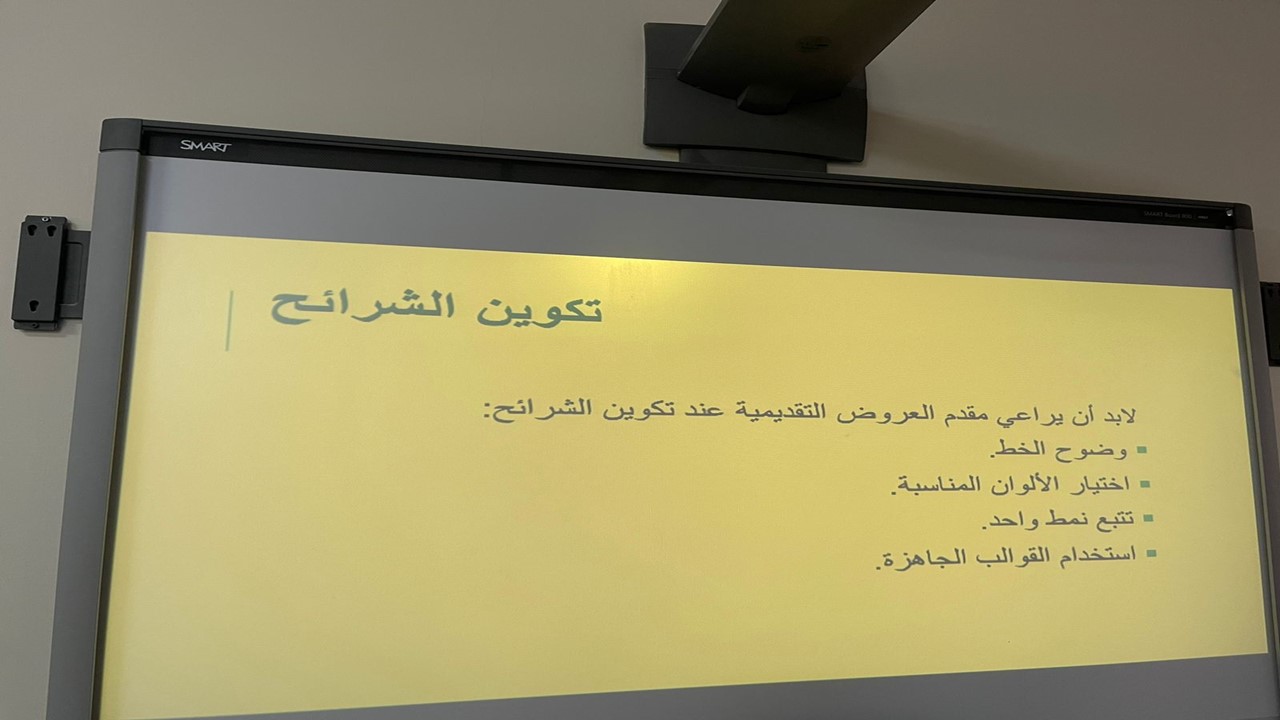 نظمت وحدة التدريب والتخطيط بعمادة السنة التحضيرية - قسم الطالبات، دورة بعنوان العروض التقديمية يوم الاربعاء الموافق 3/2/ 1444هـ في تمام الساعة التاسعة صباحًا قدمتها الأستاذة لمياء الحربي. حيث اشتملت الدورة على عدد من المحاور الهامة التي تهدف إلى تعليم الطالبات على كيفية اعداد العروض التقديمية ومما يشمل عليه المحتوى وماهي خلفية الحضور. وفي نهاية الدورة طبقن الطالبات عرض تقديمي كما تعلمن خلال الدورة. حيث تهدف الدورة الى توعية وتثقيف الطالبات بكيفية اعداد العروض تقديمية اهميتها في مجالات متعددة في الاجتماعات والدورات وغيرها ، وقد نالت الدورة استحسان الحضور ودار نقاش بين الحضور عن خبراتهن في العروض التقديمية والأخطاء التي كانوا يقترفونها وأثنوا الطالبات على مقدمة الدورة لما قدمته من معلومات مفيدة وجديدة.