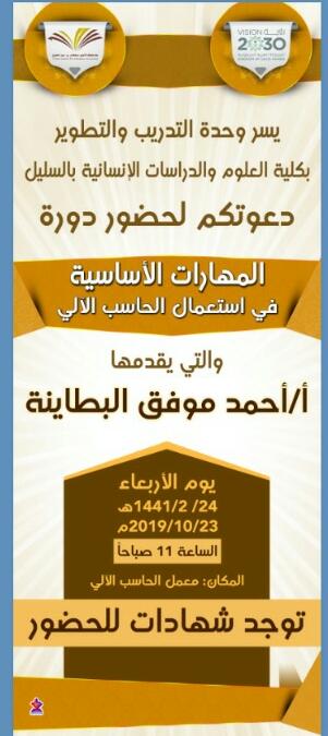 تحت رعاية سعادة عميد الكلية الدكتور/ سلمان بن صاهود العتيبي أقامت وحدة التدريب والتطوير بكلية العلوم والدراسات الانسانية بالسليل وبالتنسيق مع قسم علوم الحاسب والمعلومات دورة بعنوان " المهارات الأساسية في استخدام الحاسب الألي" يوم الأربعاء 24/2/1441هـ الموافق 23/10/2019م من الساعة العاشرة صباحاً وحتى الساعة الثانية عشرة ظهراً قدمها المحاضر / أحمد موفق البطاينة وذلك في معمل الحاسب الالي حيث حضرها عدد من طلاب الكلية والموظفين , وذكر البطاينة أن الهدف من هذه الدورة التأهيلية تزويد المتدربين بالمهارات والمعلومات الأساسية اللازمة لاستخدام الحاسب في الأعمال المكتبية وذلك بالاعتماد على مهارات حزمة برامج شركة مايكروسوفت المكتبية بالإصدارات الحديثة , وشرح للحضور كيفية ادارة الأجزاء الأساسية للحاسب باستخدام نظام التشغيل, وكذلك استخدام المهارات الأساسية لمعالجة البيانات الرقمية بواسطة برامج الجداول الإلكترونية و البريد الالكتروني وإعداد العروض التقديمية.