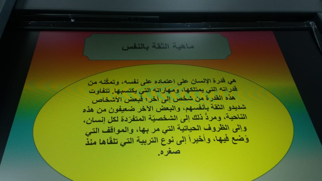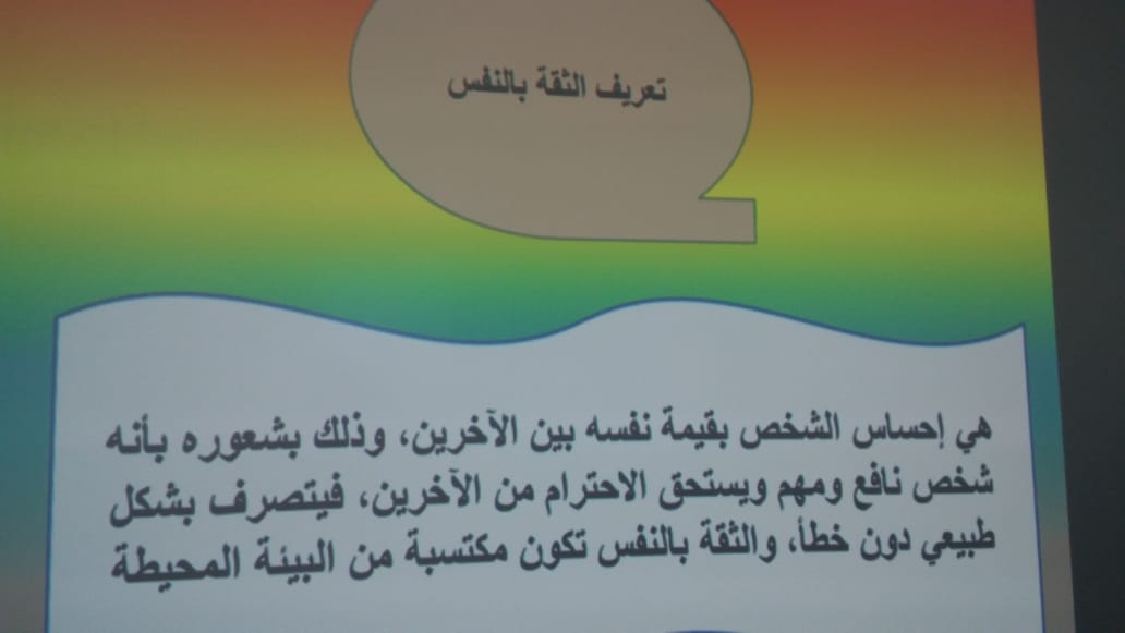 تناولت الورشة تعريف الثقة بالنفس ومظاهرها ومعوقاتها واهم استراتيجيات تقوية الثقة بالنفس.