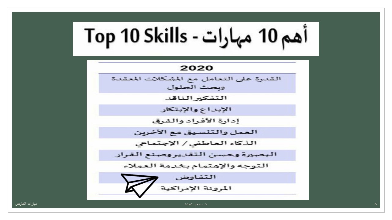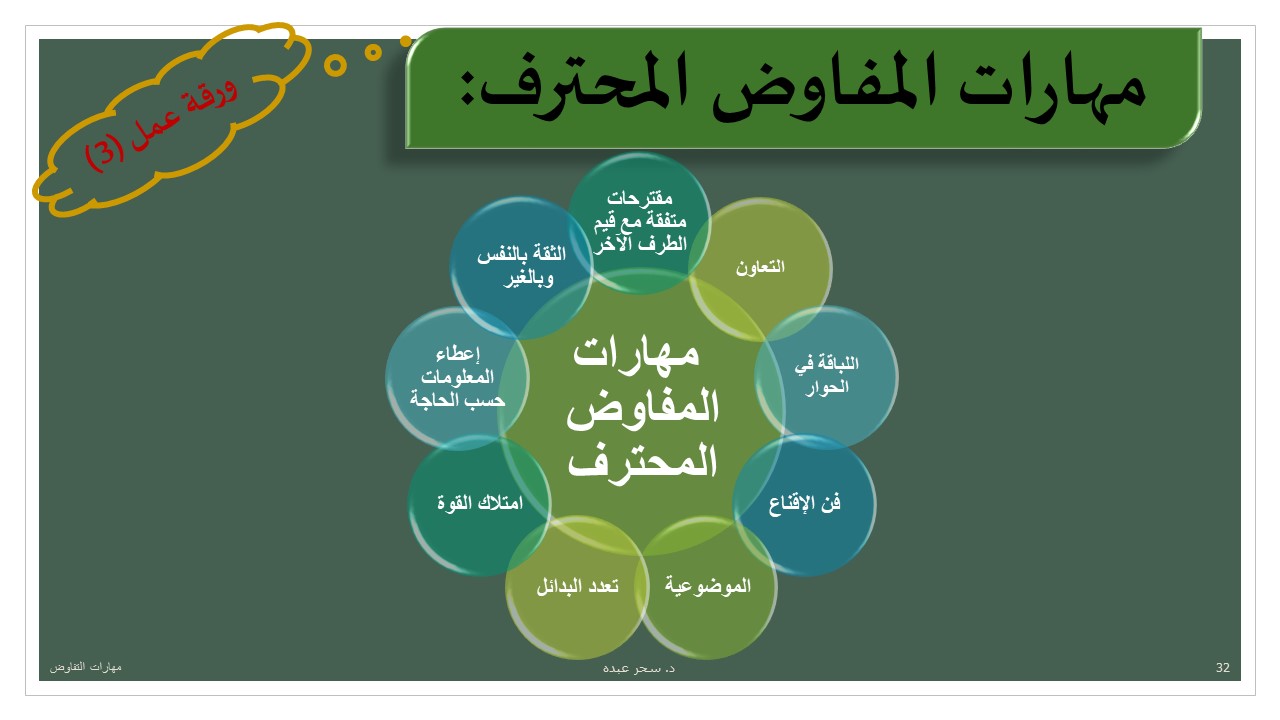 استهلت الدكتورة الورشة بتوضيح مفهوم التفاوض وانه أصيل في القرآن الكريم والسنة، كما أن مهارات التفاوض ضمن أهم عشرة مهارات بالقرن الحادي والعشرين مطلوبة في سوق العمل لتلبية طموحات رؤية2030.