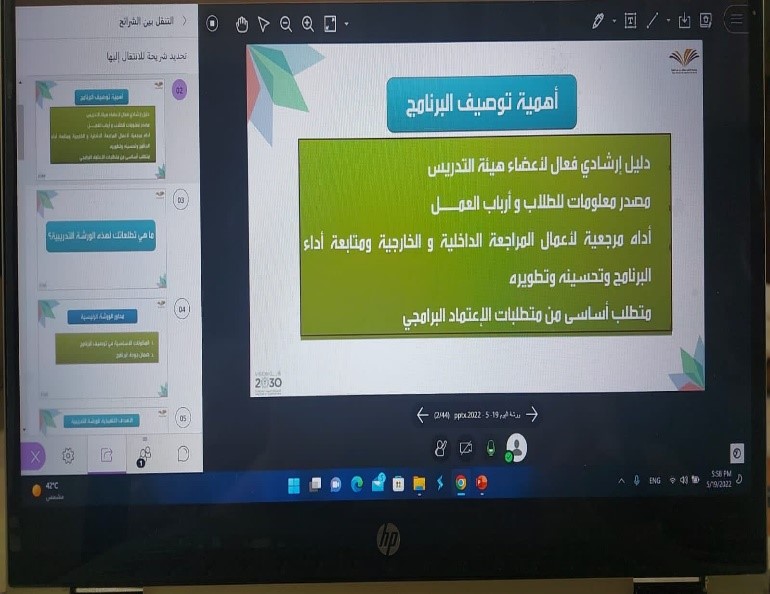 بعنوان" توصيف البرامج بناء على نماذج NCAAA " وذلك مساء يوم الخميس الثامن عشر من شهر شوال لعام 1443هـ عبر البلاك بورد.
